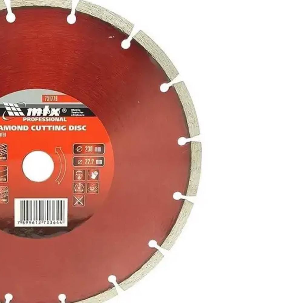 Disco de Corte Diamantado 9 POL Segmentado MTX O disco segmentado da MTX fornece uma camada de protecção do lado do desgaste de corte. As unidades de corte caracterizadas por alta concentração de diamante, melhoram a qualidade de corte por possuirem grãos de diamante e liga metálica combinada de maneira adequada. Estas vantagens proporcionam melhor desempenho e vida útil. Tamanho: 230 MM x 22,2 MM Código: 731779 Garantia: 3 meses Marca: MTX *Imagens meramente ilustrativas.
