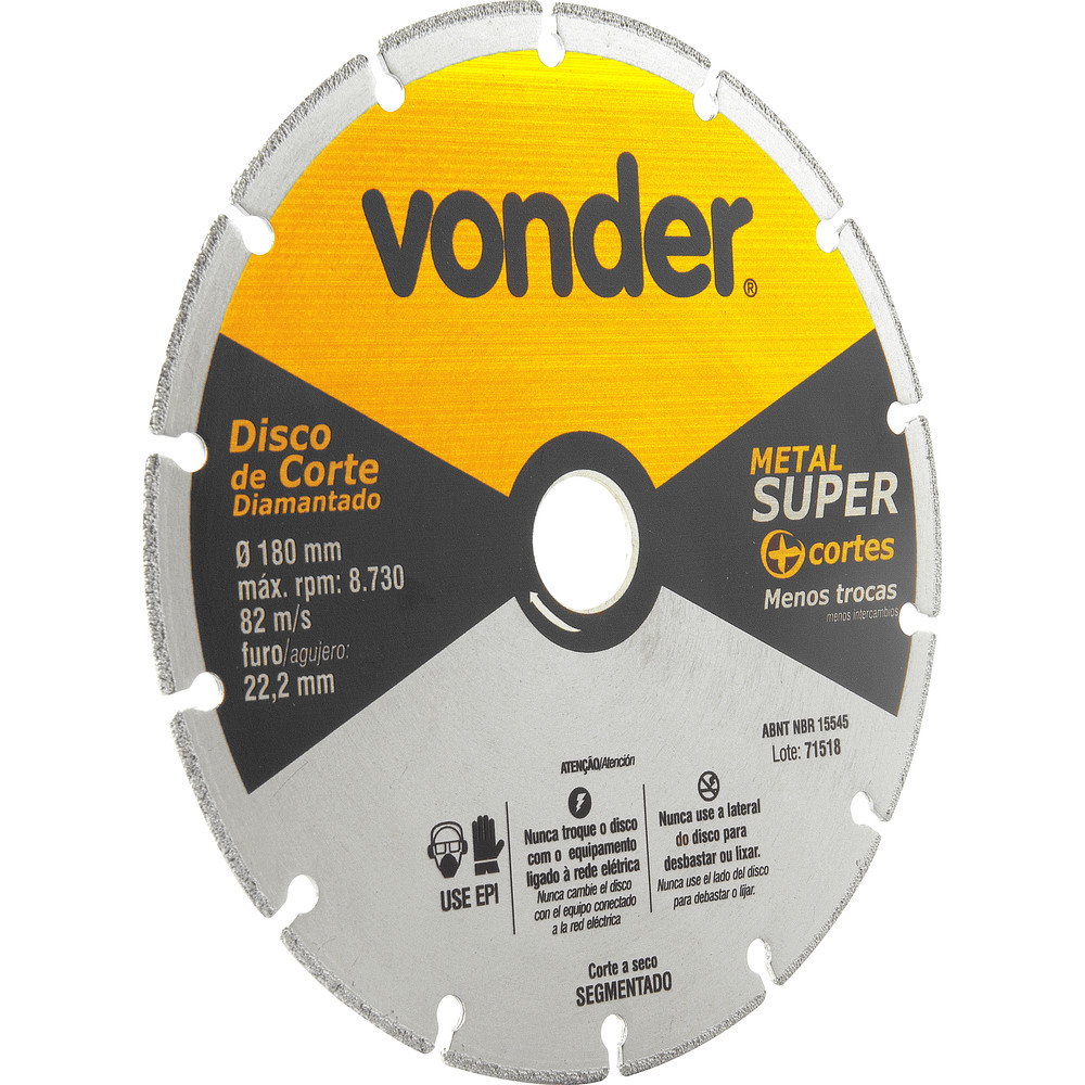 Conteúdo Embalagem: 1 Disco de corte diamantado Destaques e diferenciais: Produto de altíssima qualidade com alta performance. Comparado a um disco abrasivo convencional, pode obter um rendimento de até 10 vezes superior, considerando as mesmas condições e aplicações (espessura e dureza do material, temperatura ambiente, potência do equipamento, etc). Reduz o risco de acidentes por ser um disco de metal Aplicações e dicas de uso: Indicado para cortar metais, utilizado em esmerilhadeiras Características Técnicas: Diâmetro externo do disco de corte diamantado: 180 mm Diâmetro do furo do disco de corte diamantado: 22,2 mm Perfil do corte: Segmentado Rotação máxima (rpm): 8730 /min Segue norma: ABNT NBR 15545 Garantia: Garantia legal: 90 dias
