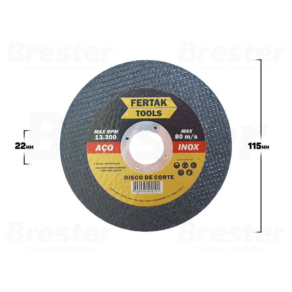 Olá, Bem vindo a Distribuidora Brester. Trabalhamos com uma grande variedade de ferramentas elétricas e manuais, descartáveis, eletroeletrônicos, artigos para casa, artigos de petshop e outros. Aqui você encontrará Produtos Originais, Nota Fiscal, Pronta Entrega e Envio Imediato! * Características do produto * Kit 10 Discos De Corte Inox Fertak O Disco de Corte Inox Fertak foi projetado para oferecer cortes precisos e rápidos, economizando seu tempo e esforço. Com este disco você aumentará a sua produtividade. Realize mais tarefas com facilidade, garantindo resultados de alta qualidade. Não perca mais tempo e adquira já o seu! Características do Produto: > Disco mais durável e áspero, para uma maior vida útil; > Ideal para cortes de metais nobres, como o aço inox, aço carbono e ferro. Especificações Técnicas: > Marca: Fertak; > Rotação Máxima: 13.300 RPM/ 80 m/s; > Diâmetro Externo: 115 mm; > Espessura: 1,2 mm; > Furo: 22,2 mm. > Peso Aproximado: 240g. - Marca: Fertak - Garantia: 90 dias contra defeitos de fabricação Vantagens de comprar na Brester: - Nota fiscal para Pessoa Física e Pessoa Jurídica; - Produto novo, com garantia de fábrica; - Produto a pronta entrega; - Envio em até 24hs em dias úteis após confirmação do pagamento. Obrigado por escolher a Brester Máquinas.
