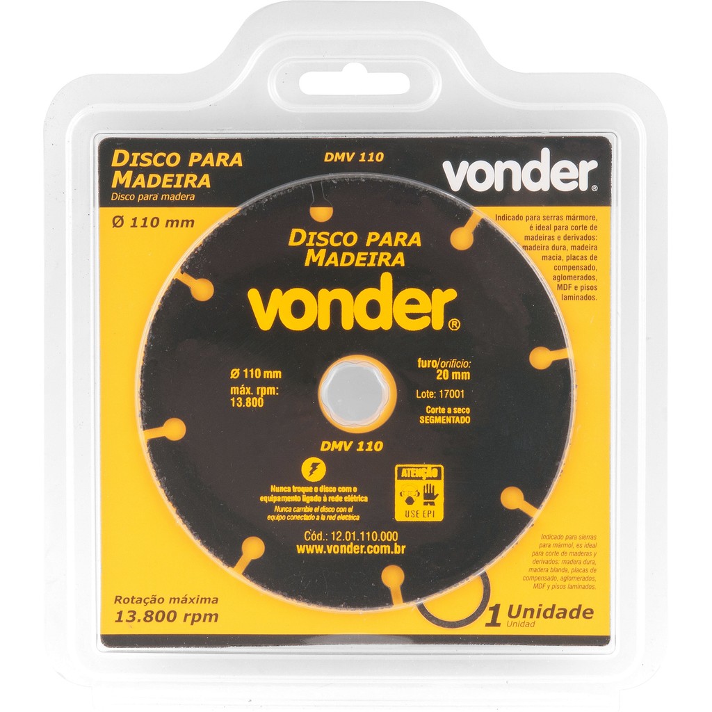 Indicado para serras mármore, é ideal para corte de madeiras e derivados: madeira dura, madeira macia, placas de compensado, aglomerados, MDF e pisos laminados. Espessura do disco: 1,2 mm. Possui borda segmentada com revestimento de carboneto de tungstênio, proporcionando um corte rápido, seguro, sem trancos e vibrações. Especificações Técnicas: - Referência: 1201110000 - Diâmetro externo: 110 mm - Espessura do disco: 1,2 mm - Massa aproximada (peso): 0,111 kg - Rotação máxima: 13.800/min - Diâmetro do furo do disco: 20,0 mm - Modelo: DMV 110 Marca: VONDER Garantia: 3 meses