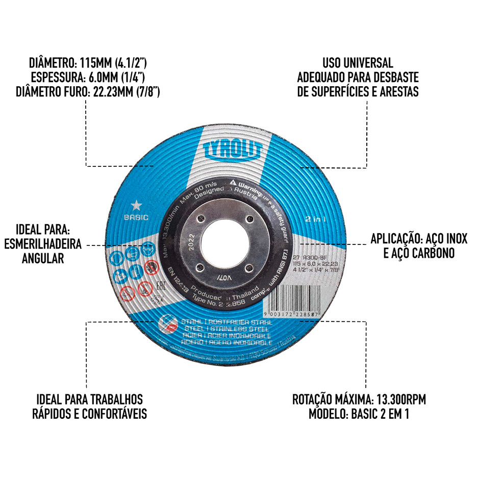 Disco de Desbaste 4.12" para Aço Carbono e Inox 115 x 6.0 x 22.23mm Tyrolit Basic 222858