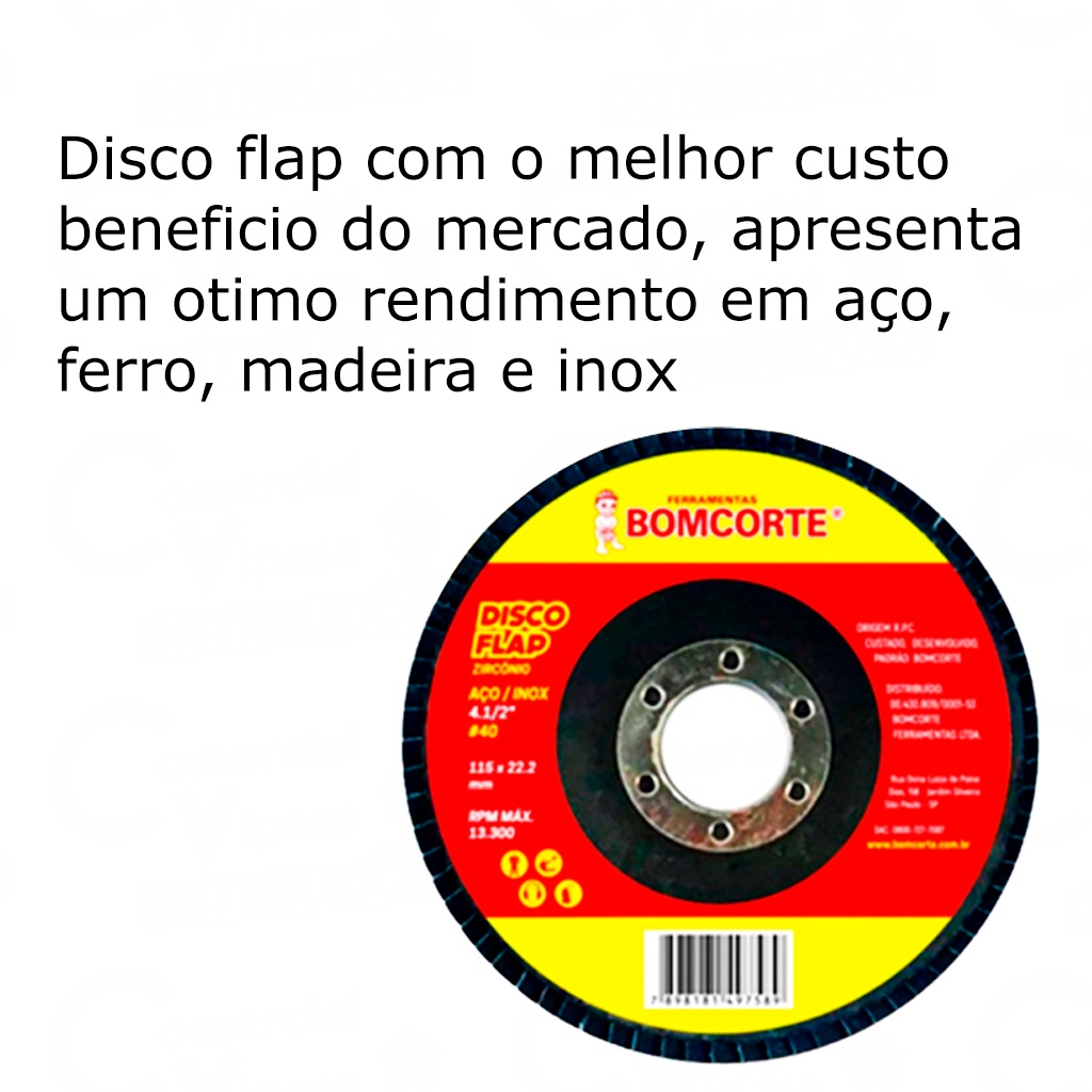 COMERCIAL VIPASA DISTRIBUIDORA .Discos de Lixa Flap zircônio para esmerilhadeira Disco Flap Óxido AlumínioAlto desempenho e produtividadeElevada capacidade de desbaste com vida útil longaDisco de lixa Cônico em lamelas sobre prato de base em fibra de vidro Aplicação:Desbastes de madeira e metal em geralPossui anel interno de aço especialDiâmetro do disco: 4.1/2” (115mm)Diâmetro do furo: 7/8” (22,2mm)Grãos: 4.1/2'' GRÃO 40 , 7 POL GRÃO 40, 4.1/2'' GRÃO 60,. 7 POL GRÃO 60, 4.1/2'' GRÃO 80,, 7 POL GRÃO 80,,4.1/2'' GRÃO 120,,7 POL 120RPM: 13.300 – 80m/sDESCRIÇÃO GERAL:O disco de desbaste flap de zircônio para esmerilhadeira é uma ferramenta utilizada principalmente para desbaste, remoção de material e acabamento em superfícies de aço inox e ferro. Ele é composto por uma série de abas ou "flaps" revestidos com grãos abrasivos de zircônio, que permitem uma remoção eficiente de material e um bom acabamento superficial.A esmerilhadeira é uma ferramenta versátil amplamente utilizada na indústria metalúrgica, construção civil, marcenaria e outros setores. O disco de desbaste flap é uma opção popular para trabalhos de desbaste em metais, pois oferece boa durabilidade e eficiência.O disco de desbaste flap de zircônio para esmerilhadeira é útil para:Desbaste e remoção de material em superfícies de aço inox e ferro.Acabamento superficial em peças metálicas.Preparação de superfícies para processos posteriores, como soldagem ou pintura.É importante seguir as instruções de segurança e as especificações do fabricante ao utilizar esse tipo de disco, para evitar acidentes e garantir um desempenho adequado. COMERCIAL VIPASA DISTRIBUIDORA.