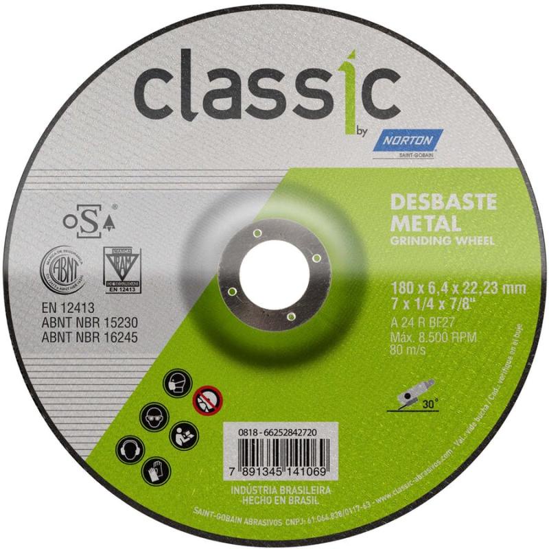 Disco de Desbaste Metal 7 POL x 6,4 MM Furo 7/8 POL Classic Kit 10 Peças NORTONQuantidade na Embalagem: 10 unidadesOperação: DesbasteIndicado para desbaste em geral e manutenções industriais leves.Para Aço e InoxBENEFÍCIOS:Remoção de soldas e rebarbasSuper-rendimentoAlta remoçãoAPLICAÇÕES:Aço e suas ligasFerro fundido modularBronze duroMateriais ferrosos em geralESPECIFICAÇÕES:Quantidade: 10 unidadesTipo: 27Diâmetro: 180mm (7)Reforço: 3 telasEspessura: 6,4mmFuro: 22,23mmDimensões: 18 x 2 x 18 cmPeso: 0,400 kgMarca: NortonCódigo de Fábrica: 66252842720*Imagens meramente ilustrativas.