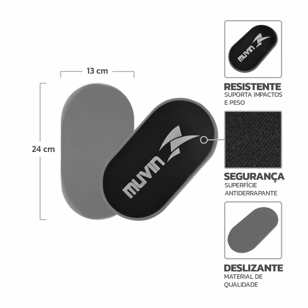 # Auto Equip # Seja bem-vindo(a)!!! --- Descrição: Disco de Deslizamento Preto/Cinza- Par - Muvin - DDZ-100 Conteúdo da Embalagem: - 02 Disco de Deslizamento - Par - Muvin - DDZ-100 TREINO COMPLETO E FUNCIONAL: O Disco de Deslizamento Muvin DDZ-100 é um acessório versátil que potencializa seus treinos de pilates, funcional e exercícios em casa, auxiliando na execução de agachamentos, flexões, pranchas e movimentos de deslizamento. Ideal para trabalhar equilíbrio, força e coordenação de forma prática e eficiente. ALTA RESISTÊNCIA E DURABILIDADE: Fabricados em plástico poliestireno (PS), um material termoplástico de alta resistência a impactos e grandes cargas, os discos oferecem desempenho seguro e duradouro mesmo em treinos intensos. A base deslizante foi desenvolvida para garantir movimentos suaves em diversos tipos de piso, como cerâmica, madeira e tapete. RESULTADOS VISÍVEIS: Com o uso regular dos core sliders Muvin, é possível fortalecer e tonificar músculos dos braços, pernas, abdômen, ombros, costas e glúteos. Além disso, eles contribuem para melhorar a estabilidade corporal, o alongamento muscular e a resistência física, tornando seus treinos mais completos. PORTÁTIL E PRÁTICO: Por serem leves, compactos e vendidos em par, os discos podem ser transportados facilmente em mochilas ou bolsas esportivas. Isso permite que você leve seu treino para qualquer lugar — seja em casa, na academia ou em viagens. VERSATILIDADE DE USO: Os Discos de Deslizamento Muvin são ideais para quem deseja variar os exercícios e aumentar o nível de dificuldade dos treinos. Com eles, é possível simular movimentos de esqui, patinação e até criar rotinas que combinam exercícios aeróbicos e de força, promovendo um treino completo e dinâmico. Características Técnicas: - Marca: Muvin - Modelo: DDZ-100 - Cor: Preto/Cinza - Material: Poliestireno de alta resistência - Peso aproximado: 160 g o par - Dimensões (cada disco): 18 cm (diâmetro) x 1,8 cm (espessura) Benefícios: - Fortalece e tonifica todo o corpo - Melhora o equilíbrio, coordenação e flexibilidade - Ideal para pilates, funcional e treino em casa - Compacto, leve e fácil de transportar - Compatível com diversos tipos de piso Importante - Garantia de 03 meses; - Enviamos em até 24h úteis; - A embalagem pode variar de acordo com o estoque do fabricante; - Imagens meramente ilustrativas; - A cor do produto pode variar de acordo com a tela do seu smartphone ou computador; - Utilize o campo de "Perguntas e respostas" e esclareça suas dúvidas com nosso suporte técnico. - Todas as informações divulgadas são de responsabilidade do Fabricante/Fornecedor