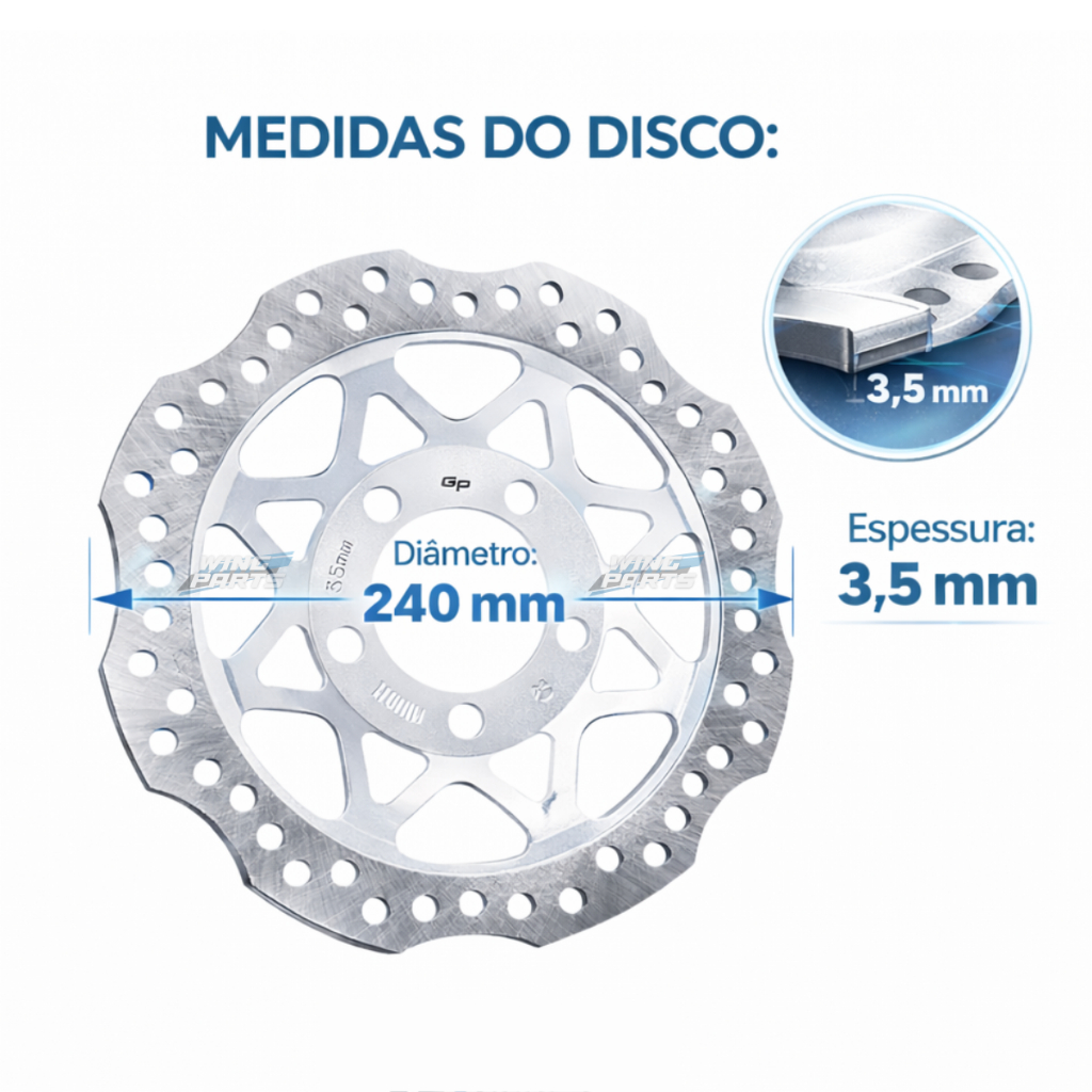 O disco de freio dianteiro 240 mm foi desenvolvido para oferecer frenagem eficiente, estável e segura, mantendo as medidas corretas para substituição direta da peça original. Fabricado com material resistente e excelente acabamento, é indicado tanto para uso urbano diário quanto para quem busca maior confiabilidade na frenagem, mesmo em condições mais exigentes. Especificações Técnicas - Diâmetro: 240 mm - Espessura: 3,5 mm - Material: aço inox de alta resistência - Acabamento: preciso e uniforme - Durabilidade: elevada, com excelente dissipação de calor - Padrão dimensional: compatível com a peça original Compatível com os seguintes modelos Honda: - CG / Fan / Cargo / Titan 150 – todos os anos - CG / Cargo / Titan 160 ABS – até 2025 - Fan 160 – até 2025 ⚠️ Sempre verifique o modelo e o sistema de freio da sua motocicleta antes da compra. Peças de excelente qualidade, e ótimo custo benefício. Ouse Sempre Com O Melhor Para A Sua Moto! >ATENÇÃO Garantia de 3 Meses. Imagens Meramente Ilustrativas. Recomendamos que a instalação seja feita por profissional especializado.