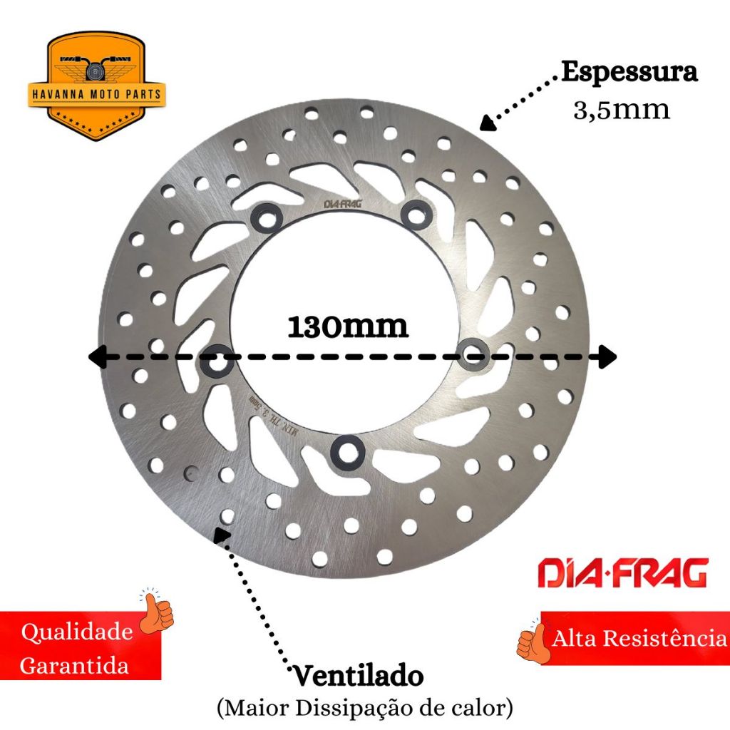 Disco de Freio Dianteiro + Pastilhas de Freio Dianteira Compatível Com: YAMAHA FACTOR 125 2009 FACTOR 125 2010 FACTOR 125 2011 FACTOR 125 2012 FACTOR 125 2013 FAZER 150 2013 FAZER 150 2014 FAZER 150 2015 FACTOR 150 2014 FACTOR 150 2015 Conteúdo da Embalagem: 01 Disco de Freio Dianteiro Diafrag 01 Par Pastilhas de Freio Dianteira DIAFRAG Urban Tech (orgânica) Código Original do Disco: 3D9-F582U-10 Características do Disco de Freio: - Quantidade Furos: 5 - Espessura: 3,5mm - Diâmetro Externo: 130mm - Produzidos em Aço Carbono de alta resistência ao desgaste; - Excelente frenagem e equilíbrio; - Discos ventilados que evitam o superaquecimento; - Frenagem mais complexa; - Aumenta a frenagem mesmo em terrenos úmidos; - Bom funcionamento do sistema de freios; - Qualidade Original; Características das Pastilhas: - Material: ferro / lona - Produzido com melhores equipamentos garantindo segurança e durabilidade. - Oferecendo o melhor custo beneficio, unindo qualidade e eficiência na sua utilidade. - Possui medidas originais - Melhor dissipação de calor e atrito com o disco de freio - Ideal Para Reposição - Maior segurança ao motociclista - Alta Qualidade E Resistência A Dia-Frag possui ampla know-how na fabricação de alumínio, materiais de fricção e borracha, e se destaca entre a tecnologia de ponta e as modernas instalações fabris com máquinas de precisão, laboratórios de ensaios, metrologia e equipamentos de precisão. Possui certificados de qualidade nacionais e internacionais. Isso mostra que todos os produtos são produzidos de acordo com as mais rígidas normas técnicas de fabricação e controle de qualidade. Importante !! Recomendamos que a instalação seja feita por profissional especializado e não nos responsabilizamos pelo mau uso do produto. Verifique, antes da compra, se as medidas das pastilhas são compatíveis com a da sua moto.