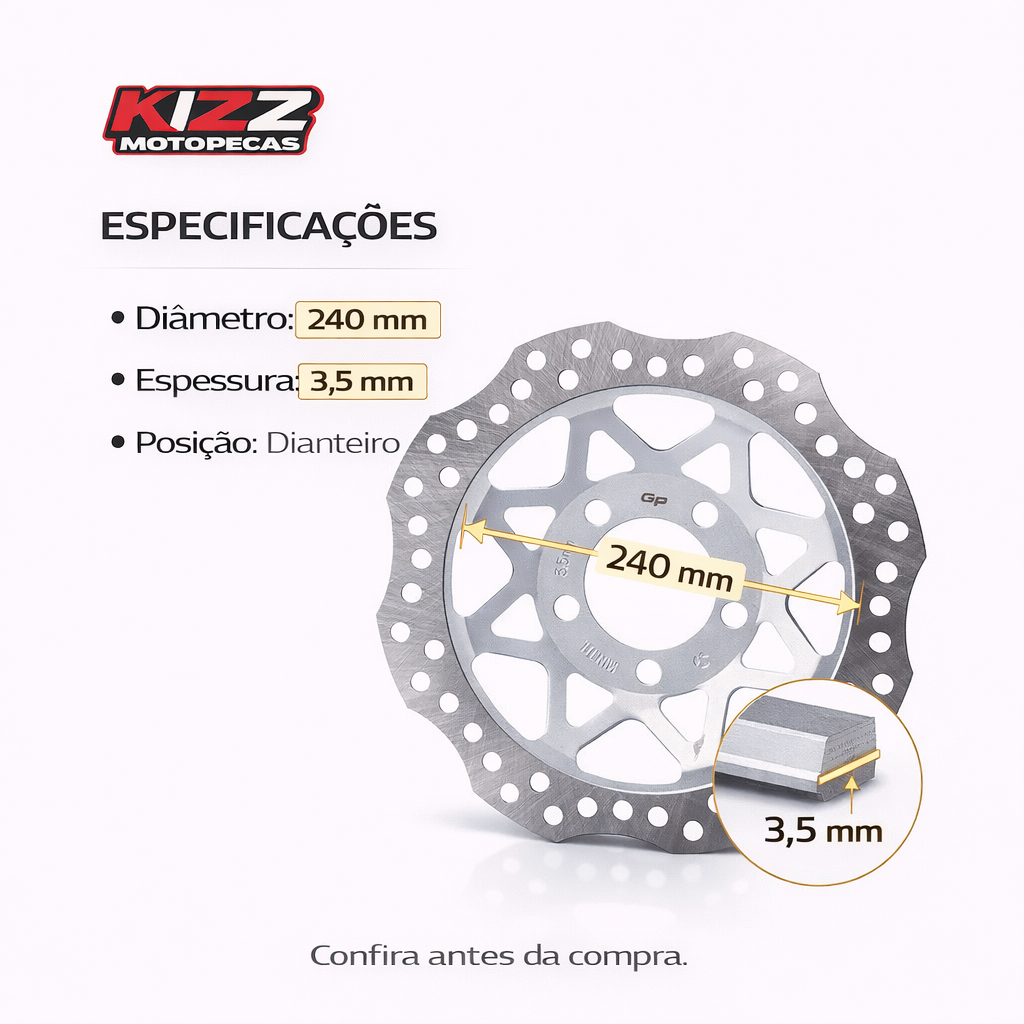 DISCO DE FREIO DIANTEIRO GP7 ESPORTIVO – HONDA CG O Disco de Freio Dianteiro GP7 Esportivo foi desenvolvido para motociclistas que exigem frenagem eficiente, segurança e visual esportivo, mantendo alto padrão de resistência para uso urbano ou severo. Fabricado em ferro fundido de alta qualidade com corte a laser, oferece melhor dissipação de calor, redução de vibração e frenagens mais precisas, prolongando a vida útil das pastilhas. BENEFÍCIOS PRINCIPAIS ✔ Frenagem mais firme e segura ✔ Melhor dissipação térmica ✔ Menor empenamento ✔ Excelente durabilidade ✔ Design esportivo ✔ Produto balanceado e pronto para instalar ESPECIFICAÇÕES TÉCNICAS Diâmetro: 240 mm Espessura: 3,5 mm Material: Ferro fundido de alta resistência Processo: Corte a laser Posição: Dianteiro 🏍 COMPATIBILIDADE – MODELOS HONDA Compatível somente com versões que utilizam freio a disco dianteiro: ✔ CG 150 Titan ESD – 2004 a 2008 ✔ CG 150 Titan Mix ESD – 2009 a 2015 ✔ CG 150 Titan Fan (com disco) – conforme versão ✔ CG 160 Titan (com disco) – conforme versão e ano ✔ CG 160 Fan (com disco) – conforme versão e ano ⚠ Atenção: ➡ Este disco não é compatível com modelos que utilizam freio a tambor ➡ Sempre confirme ano e versão antes da compra 📦 CONTEÚDO DA EMBALAGEM ✔ 01 Disco de Freio Dianteiro GP7 Esportivo 🛡 POR QUE COMPRAR NA KIZZ MOTO PEÇAS? ✔ Produto original GP7 ✔ Envio rápido e embalagem reforçada ✔ Atendimento especializado ✔ Loja referência em peças de desempenho 🔧 Recomendamos instalação por profissional qualificado Imagens meramente ilustrativas