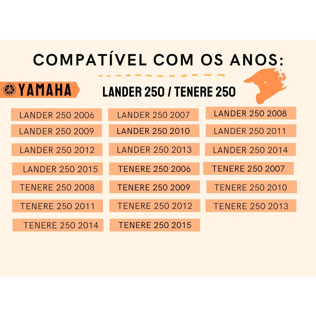 Disco de Freio + Pastilha de Freio Dianteira Conteúdo da Embalagem: 01 Disco de Freio Dianteiro Gp7 01 Par de Pastilhas de Freio Dianteira Cobreq Street (orgânica) Código Original do Disco 4B4F582T0100 Código Original da Pastilha 5RM-F5805-20 Compatível com: YAMAHA LANDER 250 2006 LANDER 250 2007 LANDER 250 2008 LANDER 250 2009 LANDER 250 2010 LANDER 250 2011 LANDER 250 2012 LANDER 250 2013 LANDER 250 2014 LANDER 250 2015 TENERE 250 2006 TENERE 250 2007 TENERE 250 2008 TENERE 250 2009 TENERE 250 2010 TENERE 250 2011 TENERE 250 2012 TENERE 250 2013 TENERE 250 2014 TENERE 250 2015 Características do Disco de Freio: - Espessura: 3mm - Disco simples ventilado, de 245 mm - Produzidos em Aço Carbono de alta resistência ao desgaste; - Excelente frenagem e equilíbrio; - Discos ventilados que evitam o superaquecimento; - Frenagem mais complexa; - Aumenta a frenagem mesmo em terrenos úmidos; - Bom funcionamento do sistema de freios; - Qualidade Original; Especificações das Pastilhas: - Ótima performance em condições secas ou molhadas; - Bom poder de frenagem - Baixa dureza do material de atrito; - Rápido assentamento inicial da superfície da pastilha à do disco de freio; - Dissipação de calor moderada; - Performance superior - Pastilha de alta duração - Maior segurança ao motociclista - Possui medidas originais - Tendência a redução de ruídos; - Boa durabilidade Importante !! - Recomendamos que a instalação seja feita por profissional especializado e não nos responsabilizamos pelo mau uso do produto. - Verifique, antes da compra, se as medidas das pastilhas são compatíveis com a da sua moto.