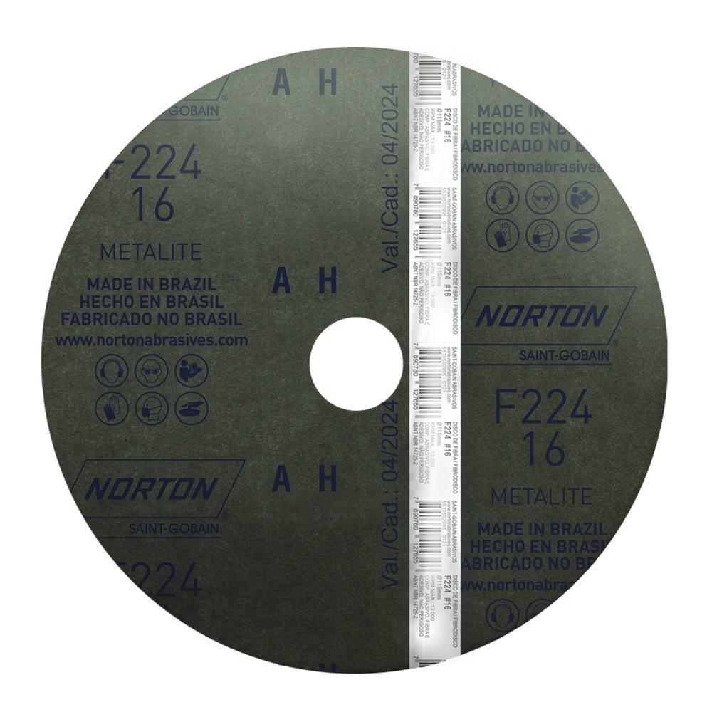 Produto: Disco de lixa de fibra 115 mm - F224 Marca: Norton Número: 36 Descrição: Disco de lixa metalite Suportam grandes esforços e altas velocidades. Especificações: Dimensões: 115 x 22 mm Grão: 16 Peso: 0.03 Kg