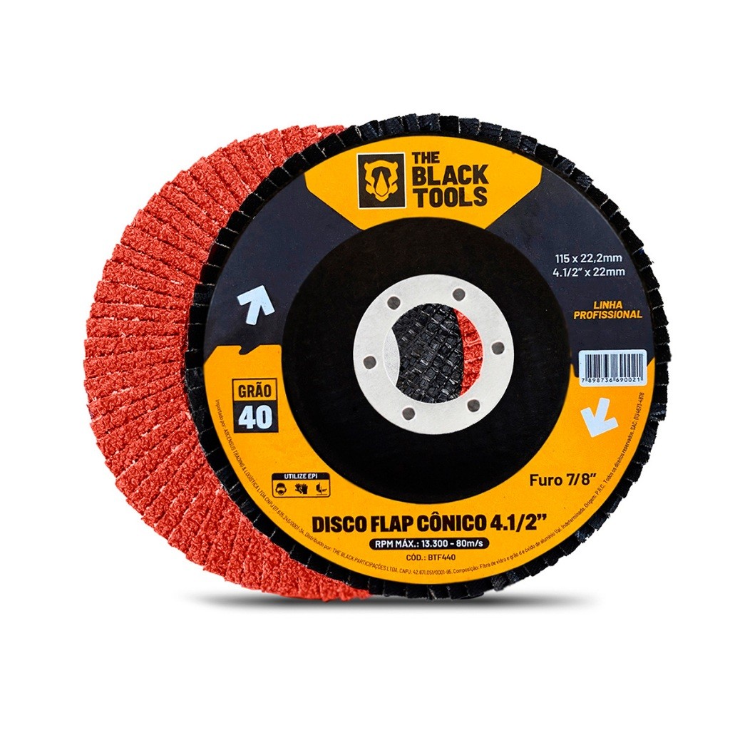 Distribuído por Ismafer Ferramentas Composto por: 10 Discos Flap 115 X 22mm Inox Esmerilhadeira BTF440 The Black Tools O Disco é indicado para desbastes, acabamento em aço inox, alumínio, metais ferrosos e não ferrosos, madeira e plástico. Aplicações em estruturas metálicas, indústria naval, fundições de metais ferrosos e indústria automobilística. Utilizado em máquinas angulares rotativas de acionamento elétrico ou pneumático CARACTERÍSTICAS: - Indicado para desbaste e acabamento em aço inox, alumínio, metais ferrosos e não ferrosos. - Desbaste e acabamento na mesma operação. - Utilizado em esmerilhadeiras angulares. - Dimensões do Disco: 115mm. - Melhor aproveitamento. - Informações Técnicas. - Costado de fibra. - Menor vibração. - Furo de 22mm. - Grão de 40. - Tipo flap. OBSERVAÇÕES: - É utilizado para desbaste em metal, madeira e outros materiais. 'Imagens Ilustrativa'. - Não exceda a velocidade do rpm especificada no disco. - Polimento molhado não é permitido. FICHA TÉCNICA: - Diâmetro 115 mm × 22,2 mm. - Max 13 300 rpm. - Grão 40. - Diâmetro 115 mm × 22,2 mm. - Max 13 300 rpm. - Grão 60. - Diâmetro 115 mm × 22,2 mm. - Max 13 300 rpm. - Grão 80. Marca: The Black Tools Modelo: BTF440 Garantia: 03 Meses SKU: KIT23101x10 - GRÂO 40 10 UNID SKU: KIT23102x10 - GRÂO 60 10 UNID SKU: KIT23103x10 - GRÂO 80 10 UNID Distribuído por Ismafer Ferramentas