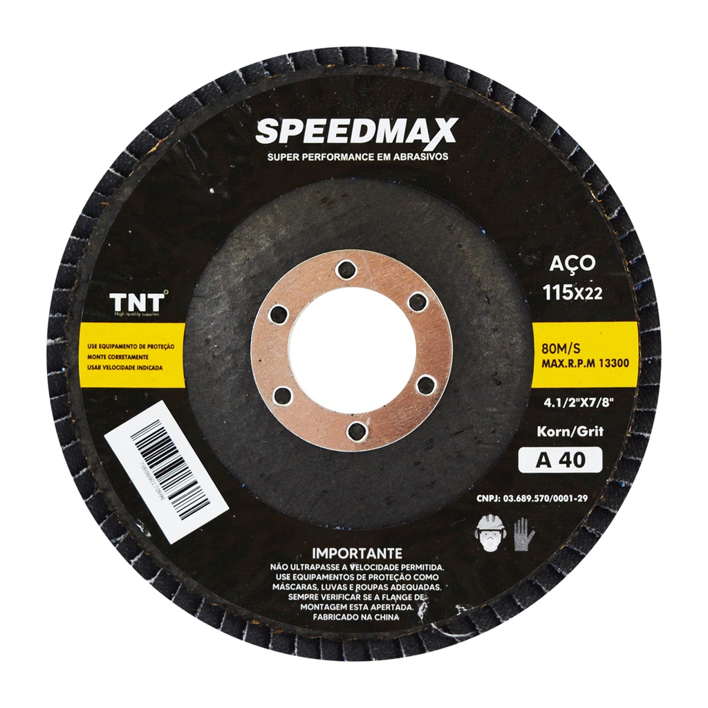 Flap com 72 folhas de lixa azuis que rendem 30% à mais que lixas marrons "O MELHOR CUSTO BENEFÍCIO DO BRASIL" Disco de lixa, flap disc 115mm de diâmetro Kit c/10 pçs Furo:22,2mm Granulação 40 Rotação máxima: 13.300 rpm Utilizado para lixamento de metais, madeiras e plásticos Marca TNT-Speedmax