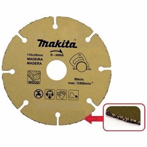 CARACTERÍSTICAS: Disco de serra para madeira desenvolvido para ser usado com serra mármore; Agora você pode cortar madeira com segurança e eficiência com a sua Serra Mármore; Visando previnir acidentes e oferecer maior segurança ao profissional que costuma cortar madeira com a serra mármore, a Makita desenvolveu o disco específico para essa finalidade; Ele possui grãos de tungstênio soldados a laser, que garante um corte rápido, suave e com alto nível de segurança evitando contragolpes; Excelente solução para a área de construção civil, podendo ser usado no corte de madeiras macias, madeiras de construção com resíduos de concreto e até mesmo em madeiras com pregos; Abertura de ventilação refrigeram o disco e evitam deformação por aquecimento; Grãos de Tungstênio garantem cortes seguros. ESPECIFICAÇÕES: Diâmetro: 110,0mm; Espessura de corte: 25mm; Aplicação: Madeira; Para Serra Mármores