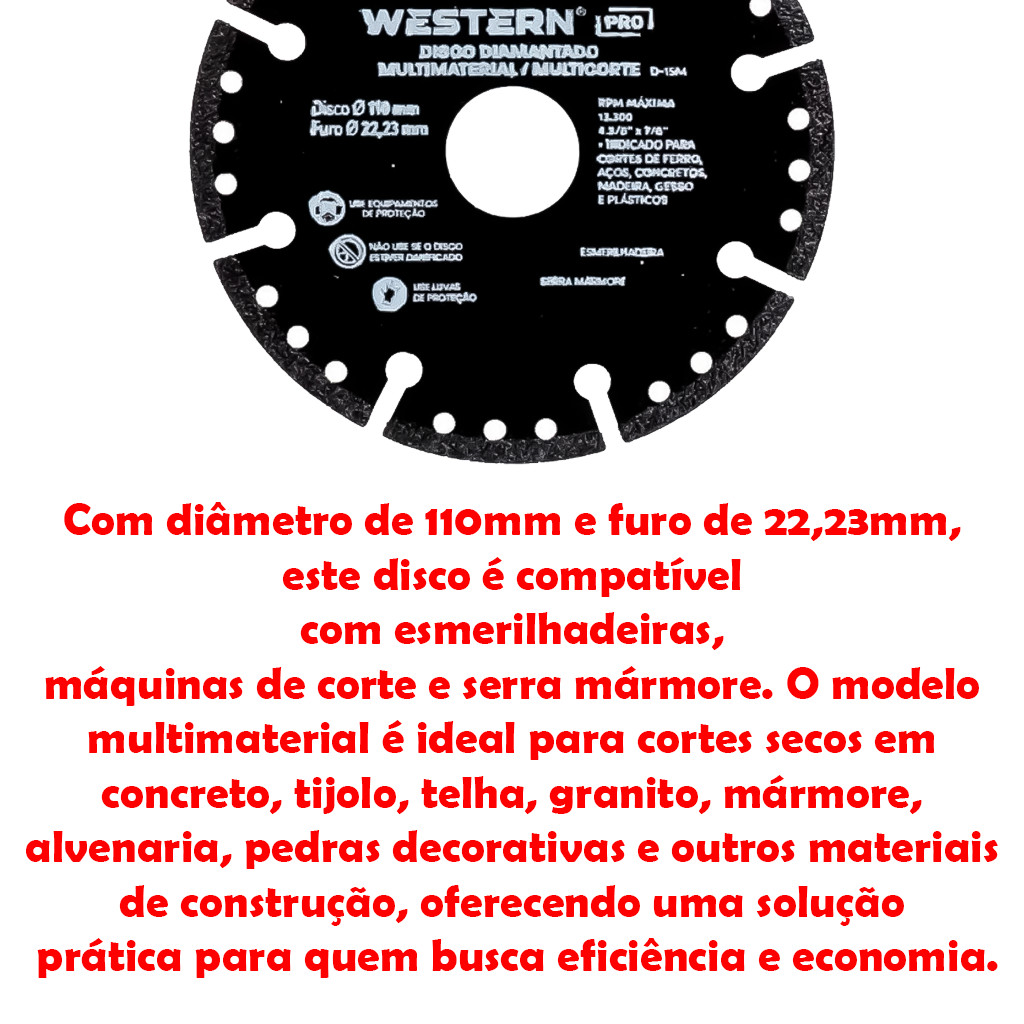 COMERCIAL VIPASA DISTRIBUIDORA. Disco Diamantado 110mm Por 22,23mm Multimaterial D-15M Corte Seco Concreto Pedra Alvenaria Disco Diamantado Multimaterial 110mm x 22,23mm D-15M – Western 🔧 Descrição do Produto: O Disco Diamantado Multimaterial D-15M da Western foi desenvolvido para oferecer alto desempenho e versatilidade no corte de diversos materiais, garantindo rapidez, durabilidade e precisão nos trabalhos profissionais e residenciais. Com diâmetro de 110mm e furo de 22,23mm, este disco é compatível com esmerilhadeiras, máquinas de corte e serra mármore. O modelo multimaterial é ideal para cortes secos em concreto, tijolo, telha, granito, mármore, alvenaria, pedras decorativas e outros materiais de construção, oferecendo uma solução prática para quem busca eficiência e economia. A borda contínua diamantada proporciona acabamento limpo, reduzindo lascamentos e aumentando a vida útil do disco. ✅ Principais Aplicações: Corte de materiais de construção como alvenaria, concreto, granito, mármore, telha, tijolos, pedras decorativas e similares. Ideal para obras, reformas, instalação de pisos, azulejos e bancadas. Uso em máquinas esmerilhadeiras e serra mármore compatíveis com furo de 22,23mm. 🛠️ Características: Tipo: Disco diamantado multimaterial Modelo: D-15M Marca: Western Uso: Corte a seco Borda: Contínua com segmentação diamantada Alta resistência ao desgaste Corte limpo, rápido e preciso Longa durabilidade Fácil instalação e substituição 📐 Especificações Técnicas: Diâmetro externo: 110mm Furo central (encaixe): 22,23mm Espessura da lâmina: Aproximadamente 1,8mm Velocidade máxima: 13.300 RPM Tipo de corte: Seco (sem necessidade de refrigeração com água) Peso aproximado: 120g 📦 Conteúdo da Embalagem: 1x Disco Diamantado 110mm x 22,23mm Multimaterial D-15M – Western disco diamantado 110mm western, disco multimaterial western, disco para corte seco 110mm, disco diamantado alvenaria, disco serra mármore, disco para cortar pedra concreto, disco diamantado granito mármore, disco 110mm 22.23mm western, disco diamante universal, disco d-15m western. Disco Diamantado 110mm Multimaterial D-15M Western – Corte Seco de Alta Precisão Disco Diamantado Western D-15M 110x22,23mm – Multimaterial p/ Concreto e Pedra Disco 110mm Diamantado Western p/ Corte Seco em Concreto, Pedra e Alvenaria Western Disco Diamantado Multimaterial 110mm – Alta Durabilidade e Versatilidade COMERCIAL VIPASA DISTRIBUIDORA.