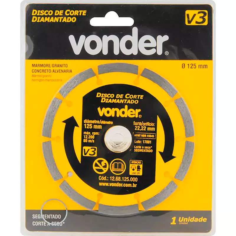 Disco de Corte Diamantado Segmentado 125MM V3 VONDERIndicado para cortar mármore, granito, concreto e alvenaria.Utilizado para reposição no cortador de parede Vonder.Os discos de corte a seco, quando refrigerados, proporcionam melhor rendimento.Para aplicações com o cortador de parede, não é indicada a refrigeração.Proporciona corte mais rápido e fácil, com maior profundidade de corte.Acompanha bucha de redução de 22,2 mm para 20 mm.DADOS TÉCNICOS:1 Disco de corte diamantado.Diâmetro externo do disco de corte diamantado: 125 mm.Diâmetro do furo do disco de corte diamantado: 22,2 mm.Tipo de corte do disco de corte diamantado: A seco.Perfil do corte: Segmentado.Rotação máxima (rpm): 12200 rpm.Segue norma: ABNT NBR 15545.Ref: 1268125000Marca: VonderGarantia: 3 meses*Imagens meramente ilustrativas.