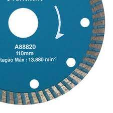 CARACTERÍSTICAS: Aplicação em concreto úmido e seco; Cortes rápidos. ESPECIFICAÇÕES: Marca: Makita; Referência: A-88820; Modelo: Disco linha premium; Diâmetro: 110,00mm; Furo: 20,0mm; Tipo: Turbo.