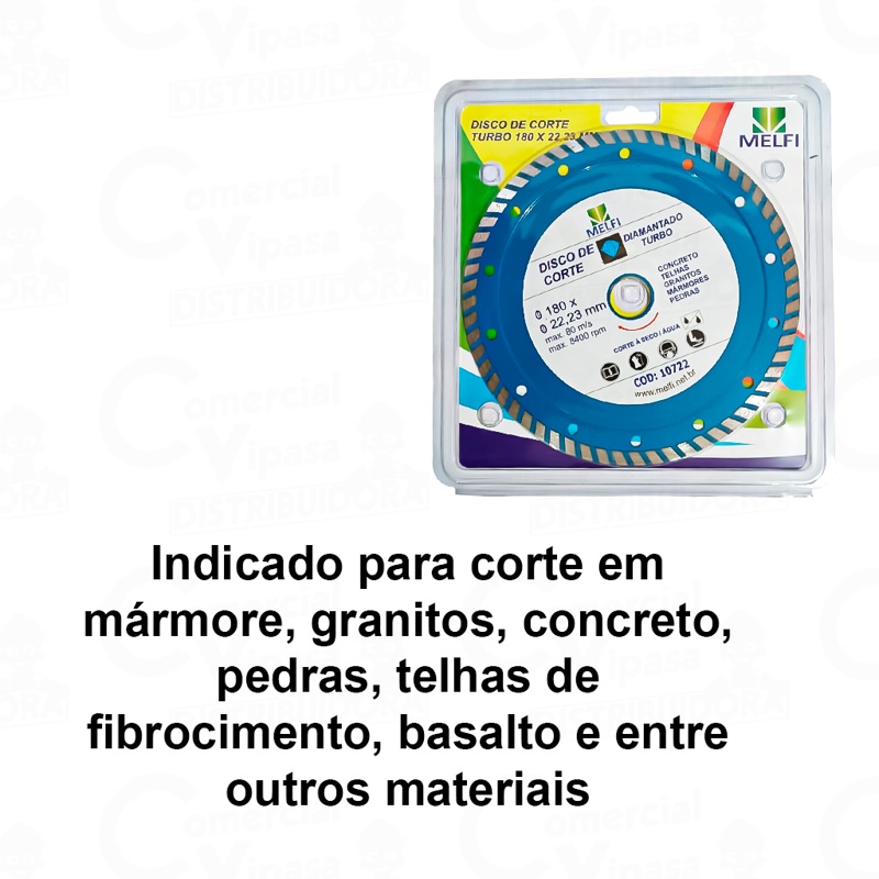 COMERCIAL VIPASA DISTRIBUIDORA. GRANDES MARCAS, PEQUENOS PREÇOS. ------------------------------------------------------------------------------------------------- Disco Diamantado Turbo 7 Polegadas 180 MM Corte Seco Disco De Corte Diamantado Turbo 180 X 22,23 MM 7"Utilizado Em Serra Mármore, Indicado para cortes em mármores, granitos, concreto, pedras, telhas, telhas de fibrocimento, basalto e entre outros materiais. Acompanha Anéis De Adaptação. Alta Concentração De Diamante. Ideal para paredes, concretos, Telhas e pisos. Medidas 180 x 22,23mm 7" Marca: MELFI AGRADECEMOS SUA VISITA COMERCIAL VIPASA DISTRIBUIDORA.