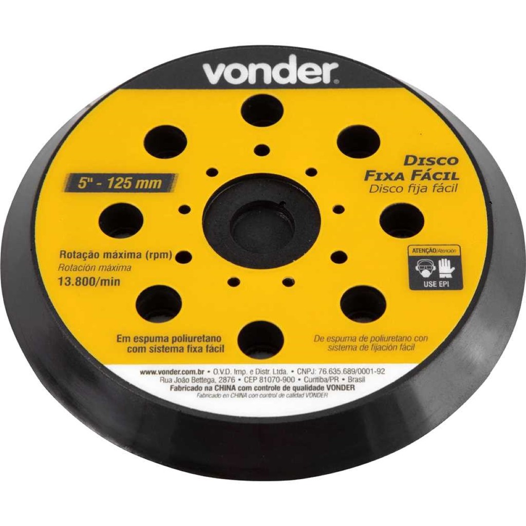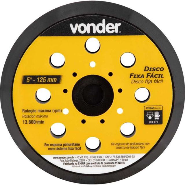 Disco Fixa Fácil 125mm para Lixadeira LRV355 Vonder: Reposição Original e Montagem Rápida Mantenha a performance da sua ferramenta com o Disco Fixa Fácil 125mm da Vonder, projetado especificamente para garantir o acabamento perfeito em seus projetos de lixamento. Este acessório é a solução ideal para quem busca precisão e eficiência, sendo compatível com as famosas Lixadeiras Roto-Orbitais LRV 355 e LRD 355. O grande diferencial deste disco é o sistema de fixação fácil, que permite a troca rápida da lixa sem a necessidade de ferramentas extras, agilizando o trabalho e aumentando a produtividade. Feito de espuma de poliuretano durável, ele adapta-se perfeitamente às superfícies curvas, garantindo um lixamento uniforme e sem marcas. Utilize-o para renovar o disco desgastado da sua lixadeira e retomar seus trabalhos de marcenaria, reformas e instalações com a mesma eficiência do primeiro dia. Especificações Diâmetro: 5" - 125 mm Material: Espuma poliuretano com sistema fixa fácil Rotação máxima: 13.800/min Peso aproximado: 0,066 kg Itens Inclusos 1 Disco Fixa Fácil 125mm Para Lixadeira LRV355 Vonder Indicações de Uso Reposição ideal para Lixadeira Roto-Orbital LRV 355 Vonder em reparos domésticos. Utilização profissional em oficinas de marcenaria e pintura para acabamento de madeira. Substituição de disco desgastado para manutenção da Lixadeira Roto-Orbital LRD 355 DWT. Perguntas Frequentes (FAQ) Pergunta: Qual a principal vantagem do sistema Fixa Fácil? Resposta: O sistema Fixa Fácil permite a troca rápida da lixa sem o uso de ferramentas, otimizando o tempo de trabalho. Pergunta: Este disco é compatível com a minha lixadeira? Resposta: Sim, ele é indicado especificamente para as Lixadeiras Roto-Orbital LRV 355 Vonder (códigos 60.01.355.127 ou 60.01.355.220) e LRD 355 DWT (códigos 60.05.355.127 ou 60.05.355.220). Pergunta: Qual a garantia do produto? Resposta: Garantia legal: 90 dias