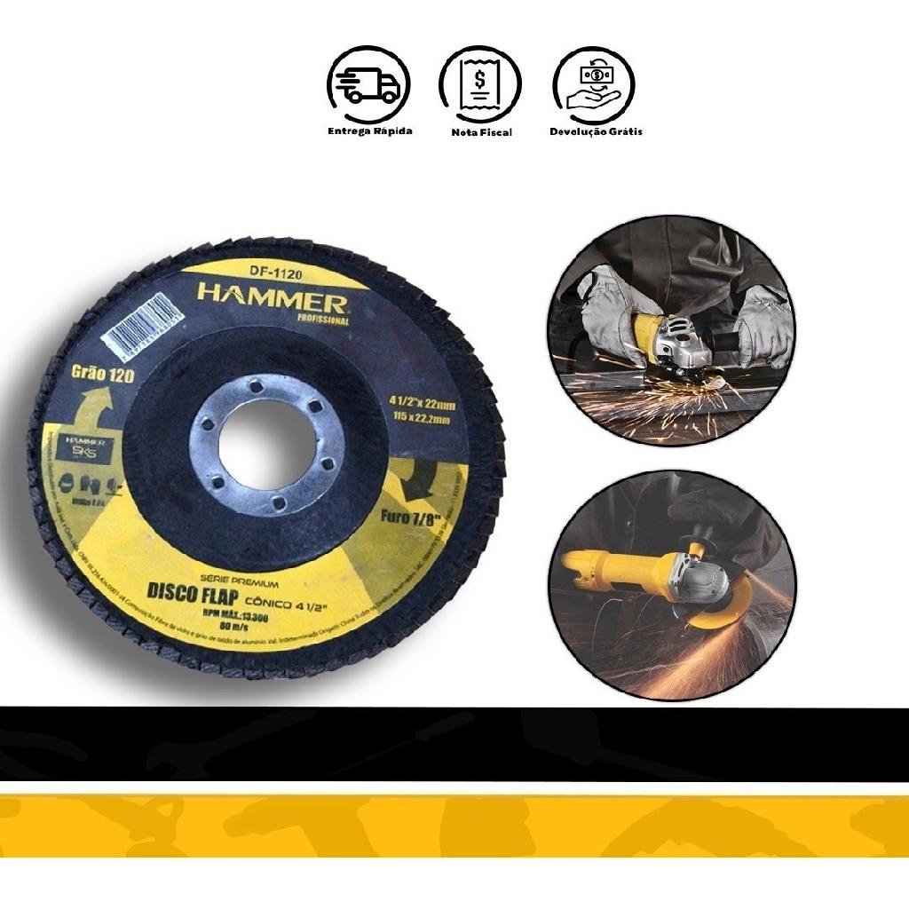 Distribuído por Ismafer Ferramentas Disco Flap Hammer Profissional 4 1/2''x22mm - Marca: Hammer - Modelo: DF-1140 - Grão: 120 - Dimensão: 115x22,2mm - Furo 7/8'' Distribuído por Ismafer Ferramentas