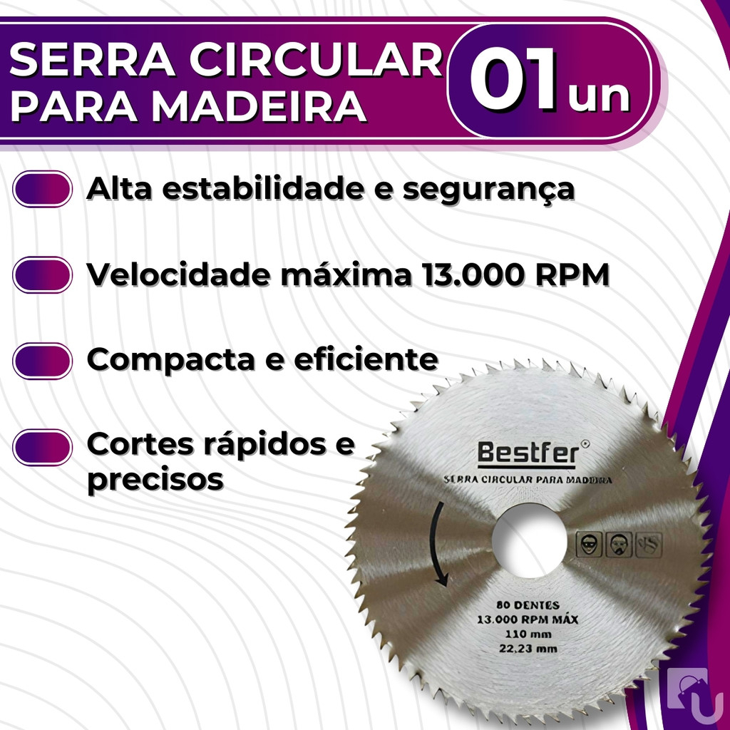 ⚙️ Especificações Técnicas Marca: Bestfer Modelo: Disco de Serra Circular Diâmetro externo: 110 mm (4”) Número de dentes: 80 dentes Diâmetro do furo central: 22,23 mm (com anel redutor 20 mm, em algumas versões) Velocidade máxima: até 13.000 RPM Material: Aço temperado / dentes de metal duro (em versões com vídea) Indicado para: Madeira, MDF, compensados, forros e chapas finas 🪚 Benefícios ✅ Cortes limpos e precisos ✅ Ideal para acabamentos em MDF e compensado ✅ Alta durabilidade ✅ Fácil instalação ✅ Compatível com serras manuais e portáteis de 4" ⚠️ Atenção Verifique o diâmetro e furo da sua serra antes da compra. Produto indicado para uso em materiais de madeira e derivados. Utilize sempre equipamentos de proteção (óculos, luvas e protetor auricular). 📦 Conteúdo da Embalagem 1 Disco de Serra Circular Bestfer 4" (110 mm) 80 dentes