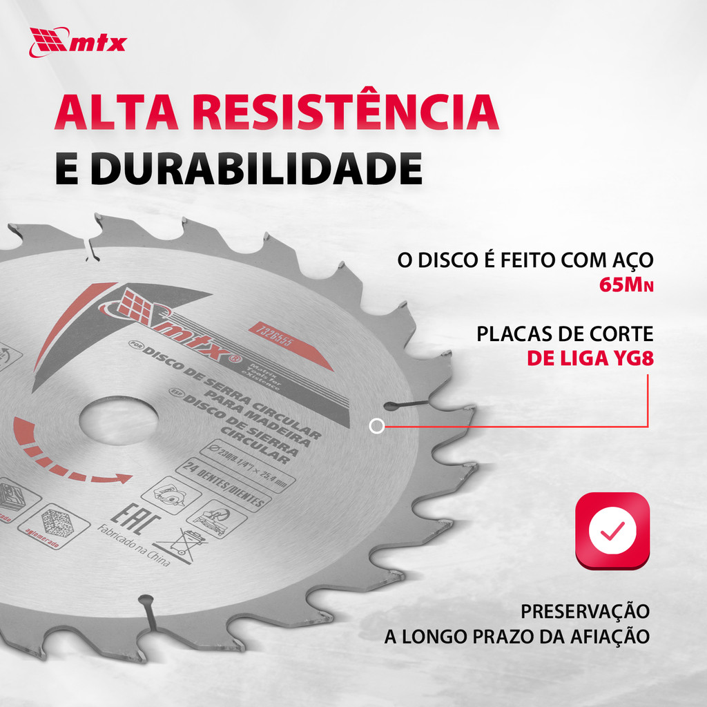 O Disco Circular Widea MTX 7326555, com suas dimensões generosas de 250 x 32 mm e equipado com 24 dentes robustos, é uma ferramenta essencial para qualquer trabalho que exija cortes em materiais de madeira, seja em um contexto doméstico ou profissional. Projetado para ser utilizado com serras circulares e de esquadria que possuam diâmetros de encaixe e externos correspondentes, este disco é altamente eficaz em cortar madeira macia e dura, MDF, HDF, compensado e placas de carpintaria, garantindo cortes rápidos e precisos. Vantagens: Corte Rápido: A presença de dentes grandes com afiação alternada é uma característica distintiva que permite uma alta velocidade de trabalho. Esta configuração é ideal para projetos que demandam eficiência e rapidez, oferecendo resultados rápidos sem comprometer a qualidade do corte. Durabilidade e Alta Vida Útil: Fabricado com uma base de aço 65Mn e lâminas de corte de liga YG8, cuja dureza é superior a 88 HRA, este disco foi desenvolvido para resistir ao desgaste e manter sua eficácia de corte ao longo do tempo. A afiação diamantada dos dentes não apenas assegura a longevidade da ferramenta, mas também mantém os cortes limpos e precisos, mesmo após uso intensivo. Operação Estável: As ranhuras de compensação integradas ao disco são projetadas para minimizar o risco de travamento durante a operação. Esta característica é crucial para garantir uma experiência de corte suave e contínua, evitando paradas inesperadas e potenciais danos tanto à ferramenta quanto ao material de trabalho. O Disco Circular Widea MTX 7326555 com 24 dentes éuma solução de corte superior para uma ampla gama de aplicações de madeira. Seu design otimizado para cortes rápidos e precisos, combinado com a durabilidade excepcional e a estabilidade de operação, faz dele uma escolha ideal para profissionais e entusiastas do faça você mesmo que buscam melhorar a eficiência e a qualidade de seus projetos de carpintaria. Seja realizando cortes simples ou enfrentando desafios mais complexos, este disco oferece o desempenho necessário para alcançar resultados excelentes com confiança e segurança.