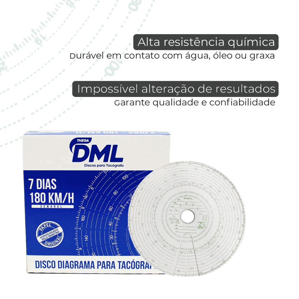 DISCO TACÓGRAFO SEMANAL 7D/125KM 20X20 - DML Os Discos Diagramas para Tacógrafos DML são responsáveis pelo registro da velocidade, distância percorrida e tempo de movimentação do veículo, com um armazenamento altamente confiável, uma vez que impossibilita a alteração dos dados registrados. Sua utilização é obrigatória para: ✅ Veículos de transporte ✅ Condução de escolares ou de passageiros com mais de dez lugares ✅ Veículos de carga com capacidade máxima de tração superior a 19 T ou com peso bruto total superior a 4.536 kg, quando produzidos a partir de 1º de janeiro de 1999. A manipulação e a alteração dos dados registrados são impossíveis, o que garante qualidade e confiabilidade;