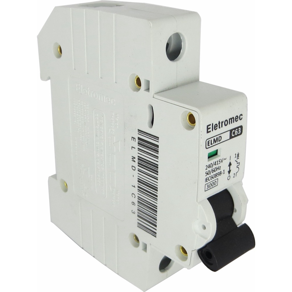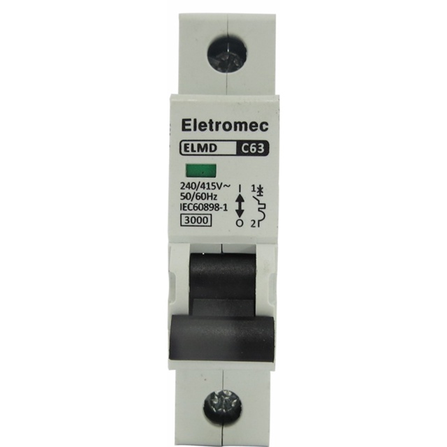 Codigo Interno: 33447000033 Codigo Fabricante: ELMD-1C63 Codigo Referencia: 33447000033 Disjuntor Mini Din 1 Polo 63A Curva C 3Ka 230/400V CARACTERISTICAS Os minidisjuntores ELETROMEC sao equipamentos de alta tecnologia que protegem fios e cabos eletricos contra curto-circuitos e sobrecargas de energia, proporcionando aplicacoes seguras e economicas em instalacoes eletricas residenciais, comerciais e industriais. Possuem contatos especiais de prata que oferecem garantia de seguranca contra soldagem. Alem disto sao produtos de disparo livre, isto e, podem disparar mesmo com a alavanca de acionamento travada na posicao liga. ESPECIFICACOES TECNICAS: Produto: Disjuntor Min Padrao: Din Polos: 1 Corrente (a): 63a Curva: Curva C Protecao: Termomagnetico Capacidade Interrupcao: 3kA Tensao (v): 230/400v Frequencia (hz): 50/60hz Marca: Eletromec Referencia: Elmd-1c63 MEDIDAS DA EMBALAGEM UNITARIA: Altura: 10 cm Largura: 3 cm Profundidade: 6 cm Peso: 115g GARANTIA DO FORNECEDOR: 3 Meses.