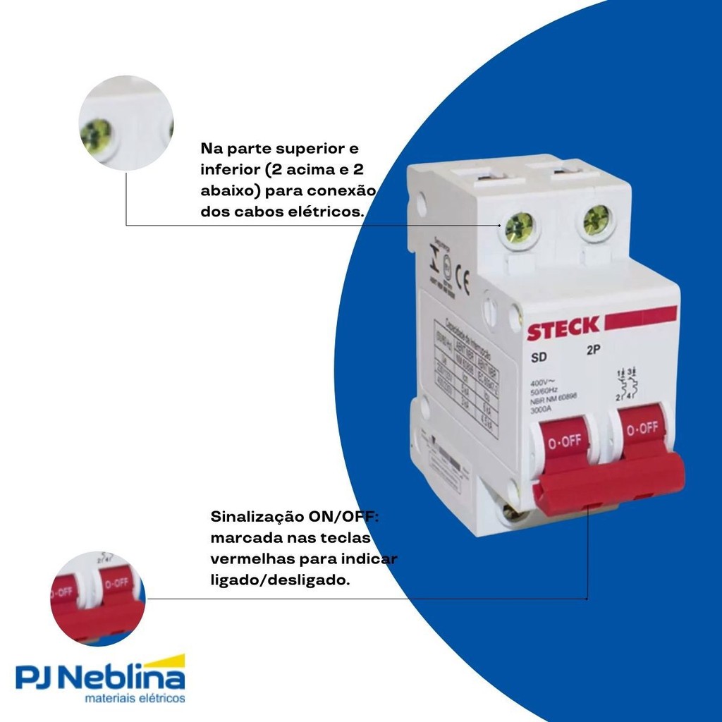 Código Interno: 22707400240 Código Fabricante: SDD62B40 Código Referencia: 22707400240 Disjuntor Mini Din Bipolar 40A Curva B 3Ka 230/400V Steck Líder no fornecimento de materiais elétricos para usos industrial, comercial e residencial. A Steck possui mais de 50 linhas de produtos e é líder absoluta de vendas e de preferência junto aos profissionais da área elétrica. CARACTERÍSTICAS: O disjuntor protege a instalação elétrica contra sobrecargas e curtos-circuitos. Ele se conecta facilmente ao trilho DIN e geralmente é instalado no quadro de distribuição, tem corrente nominal de 40A, bipolar (2P), capacidade de interrupção de 3kA e curva de disparo tipo B (proteção de circuitos que alimentam cargas predominantemente resistivas). Protegem a instalação elétrica contra sobrecargas e curtos-circuitos. Sobrecarga é uma corrente elétrica maior do que a suportável pelos fios e cabos, causadas pela ligação de muitos aparelhos simultaneamente. Provoca aquecimento elevado, danificando a isolação dos cabos. Curto-circuito é uma corrente elétrica que atinge valores altíssimos, muito superiores ao suportável pelos fios e cabos. É causado pela união de dois ou mais potenciais (Ex: Fase-Neutro / Fase-Fase), criando um caminho sem resistência. Provoca o aquecimento elevado, danificando a isolação dos fios. O disparo de um disjuntor significa que ele está protegendo a instalação. Se isso estiver acontecendo com frequência, a recomendação é pedir ajuda a um profissional para identificar o problema. A Steck é líder de mercado no Brasil. ESPECIFICAÇÕES TÉCNICAS: Linha: Mini Disjuntor Produto: Mini Disjuntor Corrente Nominal (A): 40a Nº de Pólos: 2 Curva: B Capacidade de interrupção: 3kA Garantia do Fabricante: 12 Meses.