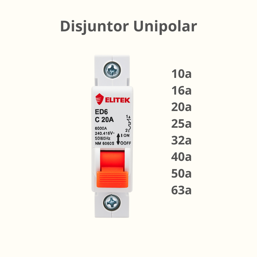 Disjuntor Unipolar DZ47-63 Elitek – Proteção e Segurança para sua Instalação ⚡ O Disjuntor Unipolar Elitek DZ47-63 garante proteção eficiente contra sobrecarga e curto-circuito, sendo ideal para instalações residenciais, comerciais e industriais. Fabricado com alta tecnologia, oferece desempenho confiável e atuação rápida, prevenindo danos à rede elétrica e aumentando a segurança do ambiente. Diferenciais e Benefícios ✅ Proteção completa: contra superaquecimento, sobrecarga e curtos-circuitos. ✅ Segurança superior: capacidade de interrupção de 4,5kA / 6kA. ✅ Alta durabilidade: componentes de qualidade que garantem longa vida útil. ✅ Versátil: indicado para aplicações industriais, comerciais e residenciais. ✅ Fácil instalação: fixação padrão em trilho DIN 35mm. 🟠 Escolha a amperagem desejada nas variações do produto: 10A 16A 20A 25A 32A 40A 50A 63A Características do Produto ✔️ Modelo: DZ47-63 ✔️ Tipo: Disjuntor Unipolar (1P) ✔️ Correntes nominais (In): 6A a 63A ✔️ Tensão nominal (Un): 230Vca (1P) ✔️ Curva de disparo: C ✔️ Capacidade de interrupção: 4,5kA / 6kA ✔️ Montagem: Trilho DIN 35mm ✔️ Marca: Elitek Por que escolher o Disjuntor Elitek? Porque ele oferece proteção confiável, desempenho seguro e excelente custo-benefício, garantindo mais tranquilidade e durabilidade para sua instalação elétrica.