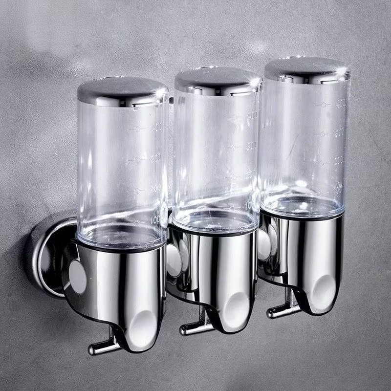 Dispensador Manual de Sabonete Líquido/Shampoo/Multifuncional Suporte Parede prateado com garrafa transparene