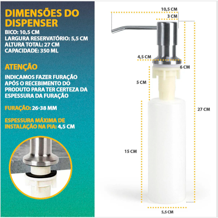 Dispenser Embutir Detergente Inox Porta Sabonete Líquido Pia Clink 350ml