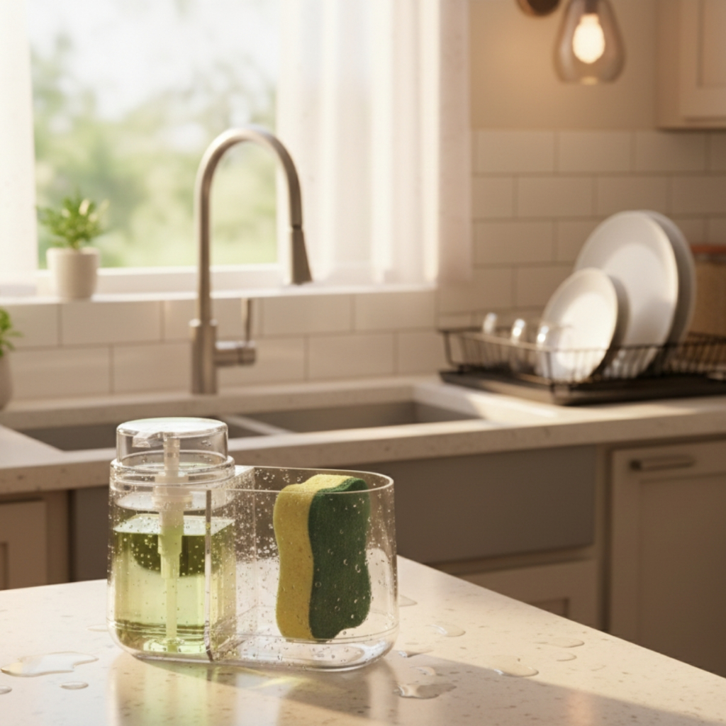 Dispenser Porta Detergente Com suporte Para Esponja Buchinha 330ml Acrílico Plasutil