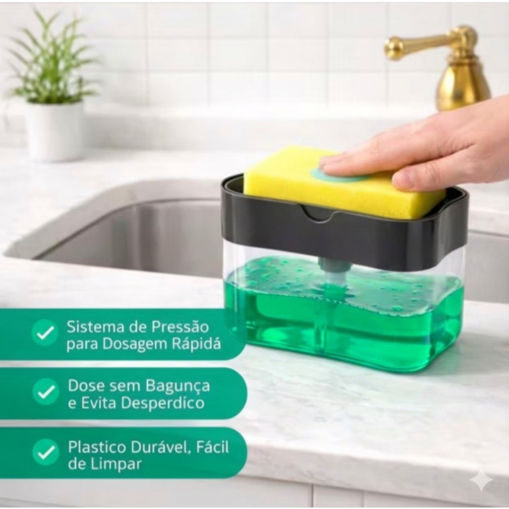 Cansado de pia bagunçada, desperdício de detergente e esponja jogada de qualquer jeito? Isso acaba agora. O Dispenser de Detergente com Porta Esponja Automático é a solução ideal para deixar sua cozinha organizada, prática e moderna. Com apenas um toque, você libera a quantidade ideal de detergente direto na esponja. Mais praticidade no seu dia a dia: ✔ Economia de detergente ✔ Pia sempre organizada ✔ Uso rápido com apenas uma pressão ✔ Esponja sempre no lugar ✔ Design moderno e compacto Ideal para quem quer eficiência, limpeza e organização sem esforço. Garanta agora o seu e transforme sua rotina na cozinha com mais praticidade! 📦 2. ESPECIFICAÇÕES DO PRODUTO Produto: Dispenser de Detergente com Porta Esponja (acompanha esponja) Capacidade: 650ml Material: Plástico resistente Cor: Preto Sistema: Pressão automática (manual) Uso: Cozinha / pia Função: Armazenar detergente e apoiar esponja Estilo: Compacto e moderno Gênero: Unissex Fácil de usar e recarregar Alta durabilidade 📏 3. TABELA DE MEDIDAS (APROXIMADA) Característica Medida Capacidade 650 ml Altura 14 cm Largura 11 cm Comprimento 9 cm Peso Aproximadamente 250 g (Medidas aproximadas, podendo variar levemente) ❓ 4. DÚVIDAS FREQUENTES ✔ Como funciona o dispenser? Basta pressionar a parte superior com a esponja para liberar o detergente. ✔ Economiza detergente? Sim. Libera apenas a quantidade necessária, evitando desperdício. ✔ Cabe qualquer esponja? Sim. Compatível com a maioria das esponjas padrão. ✔ É fácil de abastecer? Sim. Basta abrir a tampa e adicionar o detergente. ✔ Ocupa muito espaço? Não. Design compacto ideal para qualquer pia.