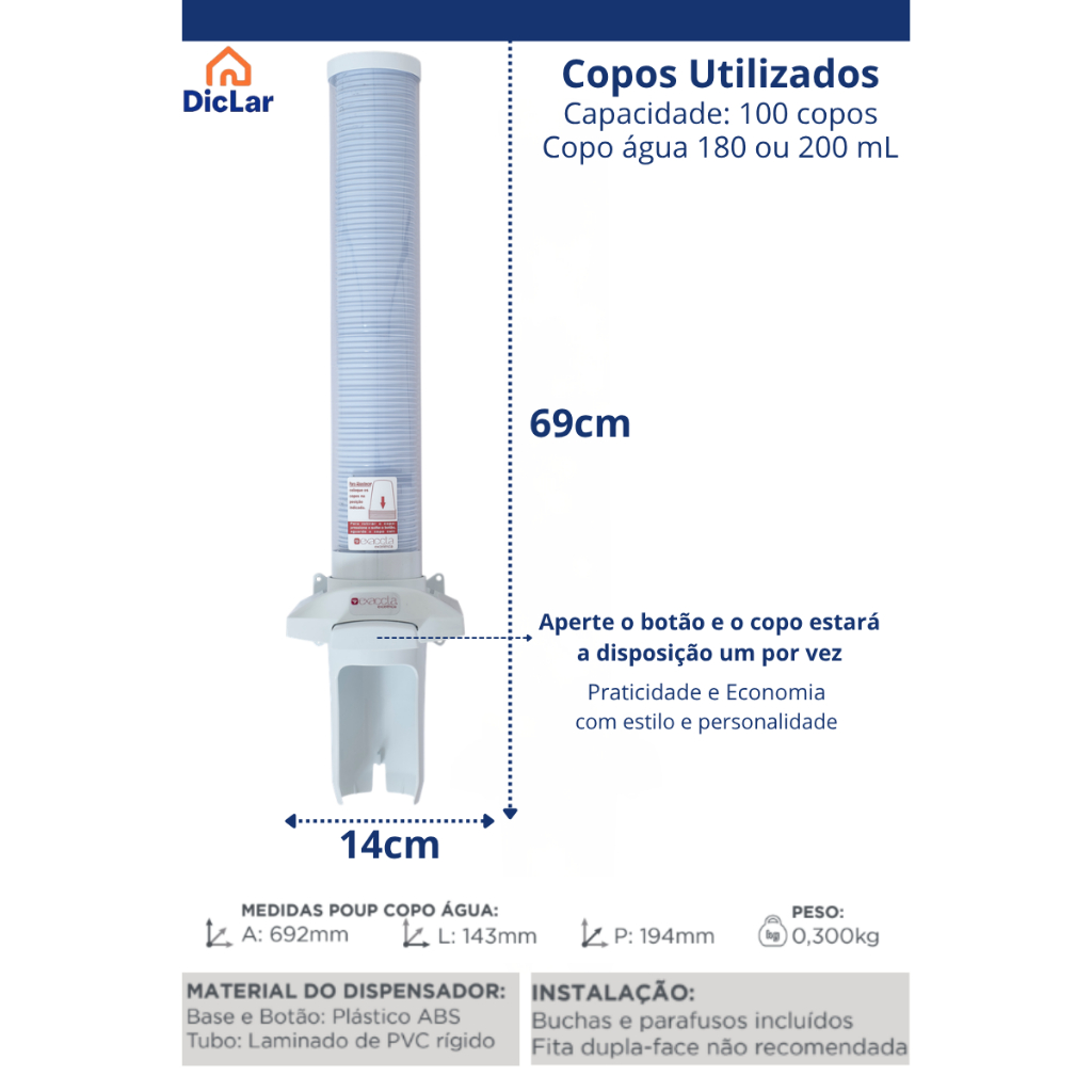 Dispensador de copos para água e café, na cor branca, modelo padrão das empresas e escritórios. Produto simples, funcional e durável. Mantém os copos protegidos, organizados e fáceis de retirar. Características: Material resistente: corpo em plástico ABS. Cor: base branca. Para copos descartáveis de 200 ml (água) e 50 ml (café). Carregamento do tubo pela parte superior. Sistema de liberação por botão. Instalação fácil em parede. Medidas: Altura total: 48 cm (copo café) / 69 cm (copo água). Largura da base: 12 cm (copo café) / –14 cm (copo água). Profundidade: 16 cm (copo café) / –19 cm (copo água). Peso: 200 g (Café) / 300 g (Água). Indicado para: Escritórios, comércios, recepções, clínicas, escolas, fábricas e qualquer local com alto uso de copos descartáveis. Vantagens: Evita desperdício. Mantém higiene. Facilita a organização. Produto nacional, fácil reposição.