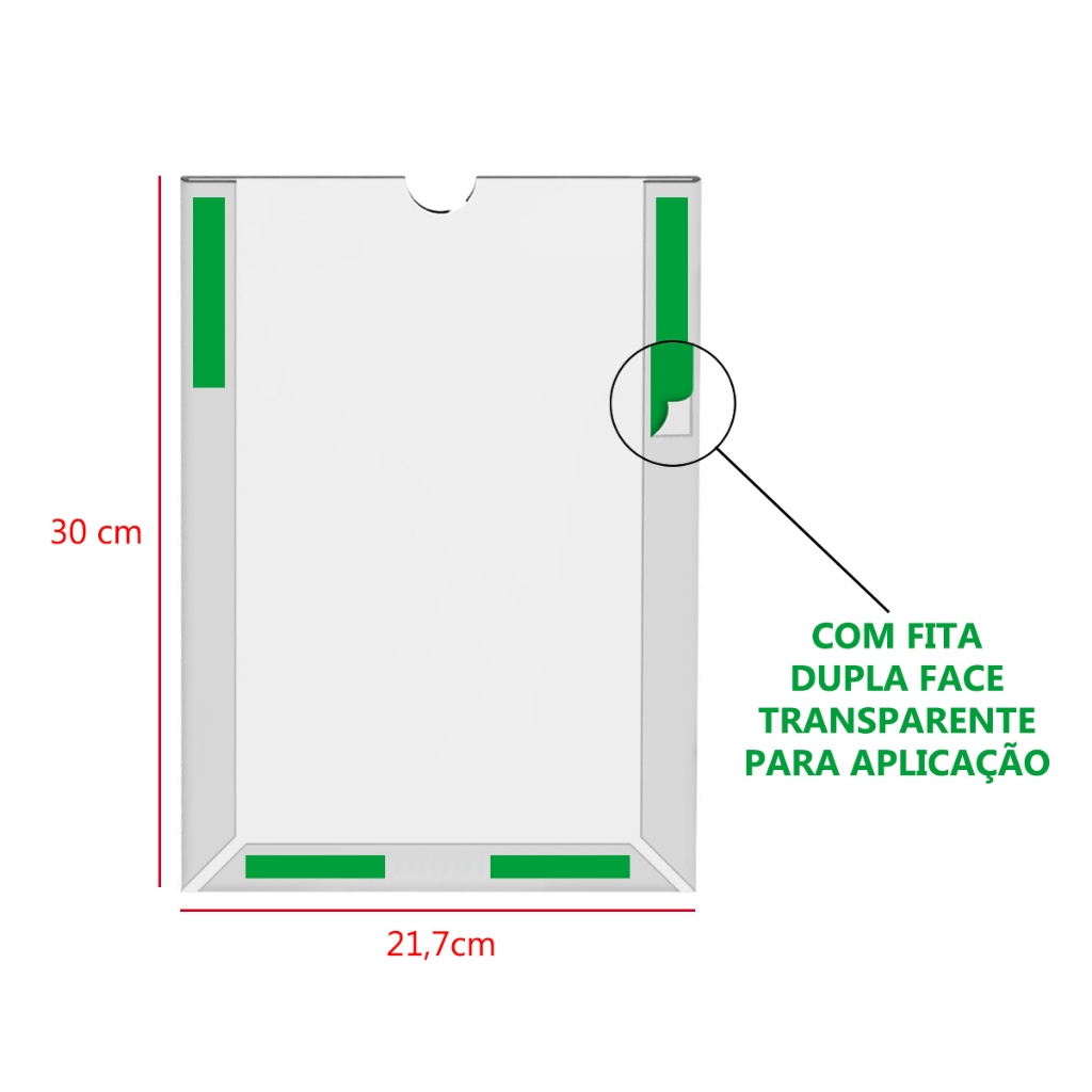 05 unid - PORTA FOLHA ou FOLHETO A4 com Fita Dupla Face Uso VERTICAL ou HORIZONTAL ATENÇÃO: RETIRAR PELÍCULA VERDE/TRANSPARENTE EM 1 OU 2 LADOS DO PRODUTO. MODO DE USO: Use pano úmido na superfície lisa onde o display será colocado, tire a proteção verde da fita dupla face, cole o produto na superfície. ESPECIFICAÇÕES: Material: PETG Capacidade: Folha A4 (21x30cm) Uso: Fita Dupla Face na Parede Dimensões do produto: 23,5cm (larg) x 31,0cm (alt) x 2,0milímetros (profundidade) Suporte de papel para porta folha e folheto A4 é o produto ideal para escritório, elevador, restaurante, loja para exposição de cartazes, anúncios, comunicados, certificados, alvarás, licenças. BENEFÍCIOS: - MELHOR CUSTO BENEFÍCIO DO MERCADO - Peça fabricada com corte a laser - Não precisa furar para usar - Fita dupla face nas bordas (laterais) para fixação Garantia do vendedor: 7 dias