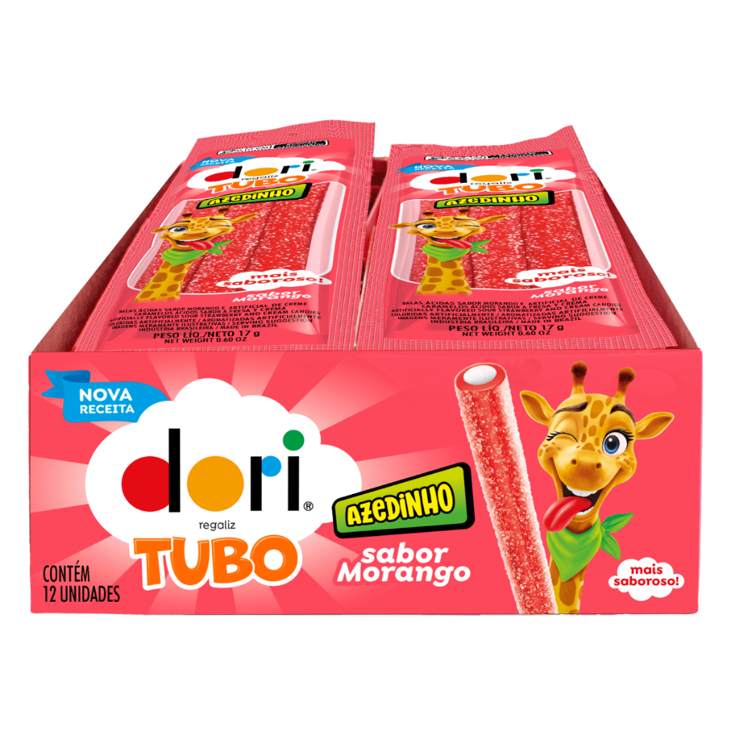 O Tubo Recheado Dori é a escolha perfeita para quem busca um doce ácido, divertido e irresistível. Produzido pela Dori Alimentos, referência em qualidade e sabor, ele combina uma cobertura azedinha com recheio cremoso sabor iogurte, garantindo uma explosão de sabor a cada mordida. Tubo Morango Sour: Açúcar xarope de maltose, farinha de trigo enriquecida com ferro e ácido fólico, extrose, amido de milho, gordura vegetal, gelatina, reguladores de acidez ácido málico (DL-), hidrogenomalato de sódio e citrato trissódico, acidulante ácido cítrico, umectante sorbitol,emulsificante mono e diglicerídeos de ácidos graxos, aromatizantes e corante artificial vermelho allura ac. Tubo Yogurt100 Sour: Açúcar xarope de maltose, farinha de trigo enriquecida com ferro e ácido fólico, extrose, amido de milho, gordura vegetal, gelatina, reguladores de acidez ácido málico (DL-), hidrogenomalato de sódio e citrato trissódico, acidulante ácido cítrico, umectante sorbitol, corante inorgânico dióxido de titâniemulsificante mono e diglicerídeos de ácidos graxos, aromatizantes e corante artificial vermelho allura ac. CONTÉM GLÚTEN. ALÉRGICOS: CONTÉM DERIVADO DE TRIGO. PODE CONTER SOJA,AVEIA,CENTEIO E CEVADA. Somos uma loja especializada em artigos de festa, confeitaria, embalagens e atacados em doces com lojas físicas no estado de São Paulo, desde 2002.