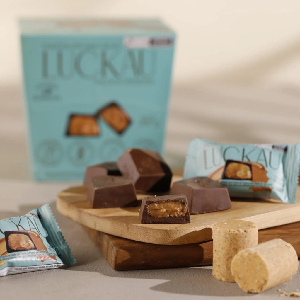 Uma nova e ainda mais deliciosa receita com o nosso amendoim: Os bombons de paçoca cremosa chegaram! Com uma inovadora formulação zero açúcar, glúten e lactose, esta é a oportunidade de saborear o Bombom Luckau 54%, combinado com a inigualável cremosidade da nossa paçoca, harmoniosamente unida a pedaços de amendoim que tornam a experiência intensa e única! Dentro da lata, você encontrará 18 Bombons de Chocolate 54% Cacau Recheado com Paçoca Cremosa, SEM GLÚTEN SEM LACTOSE SEM AÇÚCAR.. Experimente toda a leveza e sabor em cada mordida, com o sabor Luckau, que você pode saborear sem preocupações. Desfrute do seu melhor momento com Luckau.
