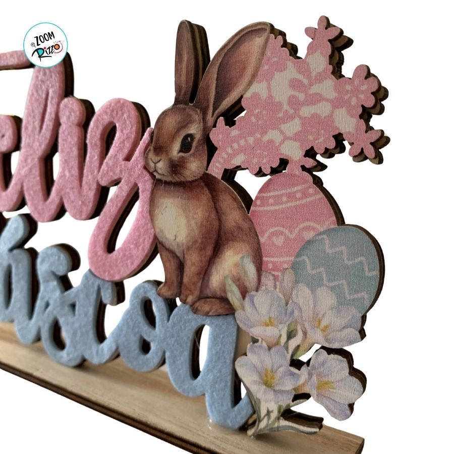 Display de Mesa em MDF de Páscoa - Coelho Flores "Feliz Páscoa" - Rosa e Azul - 18x12cm - 1 unidade - Rizzo