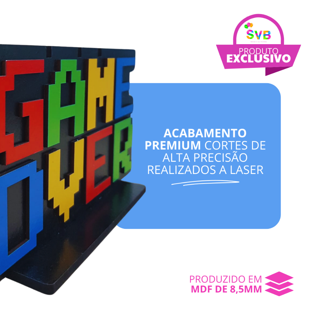🎈🎂🎈Deixe sua festa ainda mais ESPECIAL com os displays 3D da SVB 🎈🎂🎈 DISPLAY GAME OVER CENTRO MESA Marca: SVB Móveis & Festas Modelo Placa Game Over Tema Game Unidades por kit: 01 Peça Material: MDF 8,5mm Tamanho: 14x25x6cm *Consulte Medidas nas Imagens >>> EFEITO TRIDIMENSIONAL Peças desenvolvidas com EFEITO 3D, oferecendo profundidade e maiores detalhes para sua decoração; >>> MATERIAL RESISTENTE E DURÁVEL Produzidos em MDF de qualidade, com 8,5mm de espessura, pode ser reutilizado em várias festas sem perder seus atributos encantadores [Cores Vibrantes, Base Fixa e Beleza que Encanta]; >>> ACABAMENTO IMPECÁVEL Produzidos através de cortes precisos a laser, garantindo exatidão no projeto. Oferece cores vividas e vibrantes, colorindo ainda mais seus momento de felicidade - SUA FESTA! 🎂🎈 >>> ÓTIMO CUSTO BENEFíCIO Acessível e perfeito para decorar festas, compor cenários e enfeitar ambientes. Um pequeno investimento que pode lhe gerar muito retorno com Pegue e Monte. ENTREGA RÁPIDO!!! - Pedidos enviados em até 24 HORAS úteis após a confirmação do pagamento. - Tempo médio de entrega de 72 HORAS para todo Brasil. DICAS DE USO: - Combine com outros elementos decorativos para um cenário incrível. CONSULTE DISPONIBILIDADE PARA O TEMA DESEJADO. AINDA RESTAM DUVIDAS? Caso tenha alguma dúvida que não esclarecemos ainda, mande sua pergunta no campo abaixo e nossa equipe lhe responderá com prontidão. 🎈🎂 SVB Móveis e Festas, há 30 anos encantando seus momentos de festa! 🎂🎈