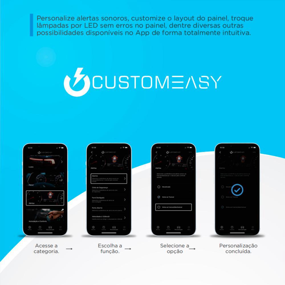 CUSTOMEASY: BAIXE O APP E VEJÁ TODAS AS CUSTOMIZAÇÕES DISPONÍVEIS PARA O SEU CARRO! - Dispositivo OBD II para personalização, coding e serviços. de forma fácil e intuitiva pelo App. - Baixe o aplicativo CustomEasy, selecione seu carro e veja todas as possibilidades de personalizações disponíveis para ele. ------------------------------------------------------------ OFERTA EXCLUSIVA DE LANÇAMENTO! ------------------------------------------------------------ - Na compra de um dispositivo CustomEasy, ganhe uma assinatura CustomToYou1! - Todas as licenças são válidas por 5 ANOS após a efetivação. O cliente poderá customizar e modificar as configurações do carro pelo prazo de 5 ANOS. -------------------------------------------------------- A Ferramenta mais rápida do mercado --------------------------------------------------------- - Além de ser totalmente simples e intuitivo, o Customeasy é a ferramenta mais rápida do mercado. Em menos de 5 segundos todas as funções já estão disponíveis para personalização, e cada configuração leva em média menos de 2 segundos para ser feita. O CustomEasy é um dispositivo OBD-II que através do App, permite realizar personalizações, ativar novas funcionalidades, acessar serviços para seu veículo dentre diversas outras opções de forma simples e intuitiva. PERSONALIDADE: - Instale Lâmpadas de LED Sem Erros: - Luzes ao Abrir o Porta-Malas Para você que sente desconforto com alguns alertas do seu carro, o CustomEasy permite selecionar suas preferencias para os alertas, como por exemplo, alertas de cinto, portas abertas, ou mesmo os alertas sonoros ao fechar trancar o veículo. - Alertas Para você que sente desconforto com alguns alertas do seu carro, o CustomEasy permite selecionar suas preferencias para os alertas, como por exemplo, alertas de cinto e portas abertas. - Segurança de funcionamento Diferente de outras ferramentas e Apps, com o CustomEasy, além da simplicidade de uso, você tem a garantia de acesso a funções totalmente testadas e compatíveis com seu carro. - Utilização: Basta conectar o dispositivo CustomEasy na porta OBD, baixar o App e você está pronto para explorar todas as funções e deixar seu carro do seu jeito. - Funções disponíveis Além das funções já mencionadas, com o CustomEasy você vai ter acesso a dezenas de outras opções relevantes para seu carro. ----------------------- Especificações ----------------------- - Alimentação: 8 a 18V - Consumo em operação: 180mA - Bluetooth: BLE 5.0 - Certificação Anatel: 03065-22-10552 - Sistema de atualização online - Garantia: 1 Ano contra defeitos de fabricação OBSERVAÇÕES DE APLICAÇÃO - LINHA FIAT, CITROEN E PEUGEOT - Para utilizar o CustomEasy mos carros da linha Fiat, será necessário adquirir o cabo adaptador modelo FT-OBD-SGW - Vendido à parte ! - Para utilizar o CustomEasy mos carros da linha Citroen e Peugeot, será necessário adquirir o cabo adaptador modelo FT-OBD-PSA - Vendido à parte ! ----------------------- APLICAÇÃO: ----------------------- Audi A1 2012 a 2014 Audi A3 2014 a 2022 Audi A4 2009 a 2022 Audi A5 2013, 2015, 2016, 2017, 2018, 2019, 2021, 2023 Audi A7 2014, 2015 Audi E-tron 2022 a 2023 Audi Q3 2013 a 2023 Audi Q5 2011, 2013, 2015, 2018, 2019, 2020, 2021, 2022, 2023 Audi Q7 2014, 2016, 2021 Audi Q8 2019, 2021 Audi RS4 2015 Audi TT 2015, 2016, 2018 Citroen C3 2023 Fiat Argo 2018 a 2023 Fiat Cronos 2019, 2020, 2022, 2023 Fiat Fastback 2023 Fiat Mobi 2017, 2021, 2022, 2023 Fiat Pulse 2022 a 2023 Fiat Strada 2021 a 2023 Fiat Toro 2017 a 2023 Ford Ecosport 2018 a 2021 Ford Ka 2015, 2016, 2018 a 2021 Ford Maverik 2022 Ford Ranger 2015, 2018 a 2023 Jeep Compass 2017 a 2023 Jeep Renegade 2016 a 2023 Peugeot 208 2023 Renault Captur 2018 a 2021 com Media Nav Renault Duster 2021 a 2024 com Media Nav Renault Kwid 2018 a 2022 com Media Nav Renault Oroch 2023 a 2024 com Media Nav Renault Logan 2012 a 2023 com Media Nav Renault Sandero 2013 a 2023 com Media Nav Toyota Corolla 2015, 2016, 2018, 2019, 2021, 2023 Toyota Corolla Cross 2023, 2024 Toyota Hilux 2023 Toyota Hilux SW4 2019, 2021, 2023 Toyota Rav4 2023 Toyota Yaris 2022, 2023 VW Amarok 2014 a 2023 VW Fox 2016 a 2022 VW Fusca 2023 VW Gol 2015 a 2023 VW Golf 2014 a 2019 VW Jetta 2010 a 2023 VW Nivus 2021 a 2023 VW Passat 2010, 2012 a 2019 VW Polo 2018 a 2023 VW Saveiro 2015, 2017 a 2021, 2023 VW T-Cross 2020 a 2023 VW Taos 2022, 2023 VW Tiguan 2010 a 2022 VW Taos 2022, 2023 VW UP 2015 a 2020 VW Virtus 2018 a 2023 VW Voyage 2014, 2017 a 2021, 2023