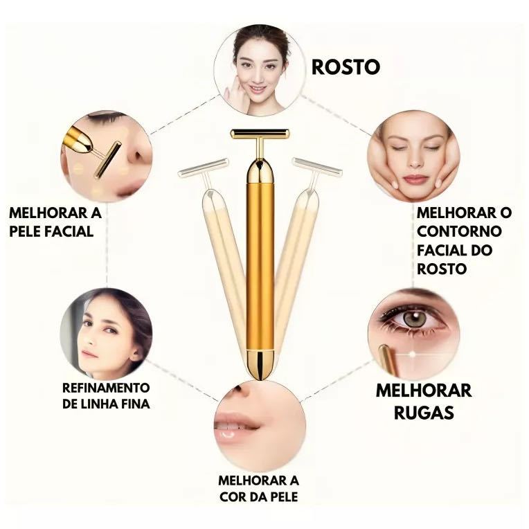 Massageador Facial Anti-Rugas, excelente para massagem terapêutica com alta vibração. Ajuda na prevenção do envelhecimento, reduz rugas faciais, firma a pele, remove papada, ajuda na absorção de nutrientes, elimina o excesso de toxinas, melhora o contorno facial e estimula os músculos faciais. Benefícios: Ajuda na prevenção do envelhecimento, estimulando a criação do colágeno, deixa sua pele saudável e renovada. Remove á papada. Reduz o volume facial. Reduz rugas faciais. Reduz olheiras. Modo de Usar: Utilizar 3 minutos por dia. Usar com cremes hidratante anti rugas,para melhores resultados. Características: Material: Cobre folheado a ouro. Gênero: Unissex. 10.000 vibrações por minuto. Dimensões Aproximadas: Altura: 14,3 cm Largura: 1,6 cm Conteúdo: 1 x Massageador Facial Terapêutico Anti-rugas 24k Alta Vibração