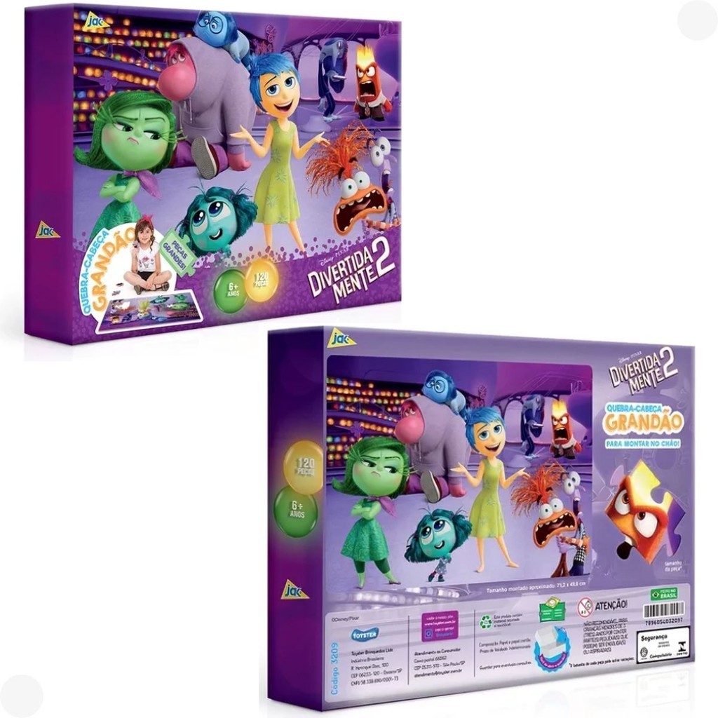 DESCRIÇÃO DO PRODUTO Divertido quebra-cabeça de chão do filme Divertidamente 2, com peças grandes que medem 6,0 x 4,8 com 120 peças Grandes, recomendado para maiores de 06 anos. CARACTERÍSTICAS TÉCNICAS: Conteúdo da Embalagem: 120 peças. Dimensões Aproximadas do Produto: 07cm x 26cm x 34cm (Altura x Largura x Comprimento/Profundidade). Dimensões Aproximadas da Embalagem: 07cm x 26cm x 34cm (Altura x Largura x Comprimento/Profundidade). Material/Composição: Papel Cartão. Idade Mínima Recomendada: A partir de 06 Amos. Participantes: A partir de 1 pessoa. Marca: Toyster. Referência: 003209 Outras informações: As cores podem variar entre as imagens mostradas acima e o produto. Imagens meramente ilustrativas. Aviso: As informações e imagens divulgadas são de total responsabilidade do fabricante/fornecedor. Produto lacrado e disponível a pronta entrega para todo Brasil! APROVADO PELO INMETRO