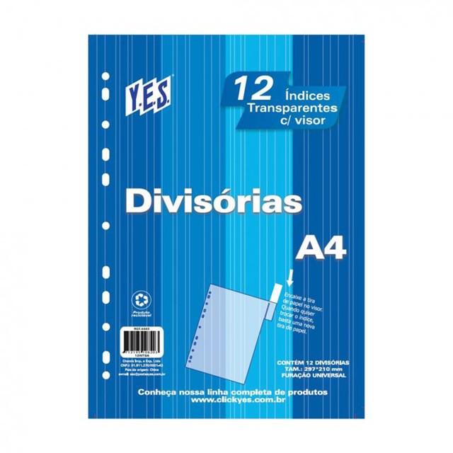 Divisória cristal A4 - 12 projeções com visor - 12INTBA-CR - Yes Descrição - Medidas: 225 x 297 mm. - Conjunto de 12 Divisórias com visor para identificação. - Tamanho A4 e furação universal. - Serve para todos os tipos de arquivos com ferragem de 2. 3 e 4 argolas. - Feito com polipropileno de alta resistência e transparência. - 100% reciclável. - Não adere ao impresso. - Acompanha índices coloridos personalizáveis para identificação.