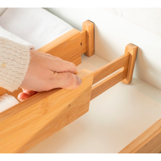 A Divisória de Gavetas Extensível garante organização e cuidado para o seu dia a dia. Possibilita o máximo aproveitamento de espaço nas gavetas, para uma rotina com mais tranquilidade e bem-estar. O bambu promove a sustentabilidade de um material 100% renovável, e traz sofisticação para decorar a sua casa.Sua funcionalidade e sistema extensível permitem a adaptação em diferentes profundidades de gaveta, para organizar qualquer ambiente da casa. Possui acabamento nas extremidades que evita dano ao mobiliário. Eleve o nível da organização com a Linha Keep e guarde o que há de melhor em cada momento. INFORMAÇÕES TÉCNICAS Dimensões: LxAxP: 2x7x56 cm. Material: Bambu CUIDADOS Utilize uma esponja macia e sabão neutro para lavar o produto. Enxágue com água abundante, evitando deixá-lo submerso na água. Após a lavagem, seque imediatamente para evitar o aparecimento de fungos e bactérias. Guarde o produto em local seco e arejado. Caso o produto apresente mofo, limpe-o com um pano umedecido em vinagre branco. CONTEÚDO DA EMBALAGEM 1 divisória de gavetas ajustável SOBRE NÓS Somos apaixonados pelo que fazemos e utilizamos o design como meio de fazer você se sentir em casa onde estiver. Criamos produtos com carinho e cuidado para atender as suas necessidades diárias, levando bem-estar, aconchego e conforto para seu lar. Somos minimalistas e funcionais pois queremos que você tenha um estilo de vida mais leve e organizado, para atingir o máximo do seu potencial. Prazer, somos Ou.