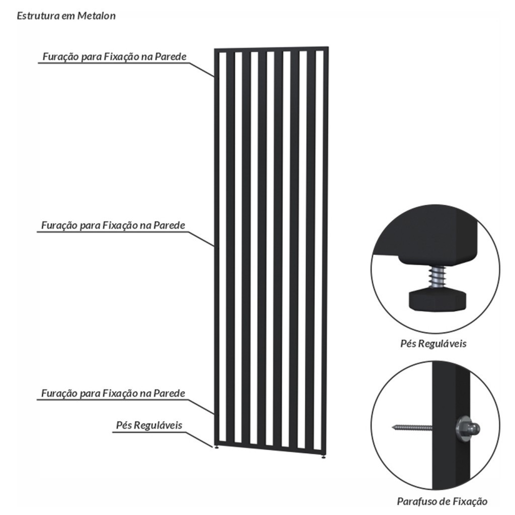Descrição: Divisoria Integrada Preto - Olivar Móveis Características: - Áreas Indicadas: Interna - Garantia: 3 Meses - Volumes: 1 - Recomendações de manutenção: Não molhar. Passar um pano úmido. Não aplicar lustra móveis. - Tipo de Pés: Pés reguláveis - Quantidade de Pés: 2 - Produto Necessita de Montagem?: Não - Material da Estrutura: Metal - Escala de Brilho: Fosco - Medida do Produto Montado (LXCXA): 2cmX60cmX199cm