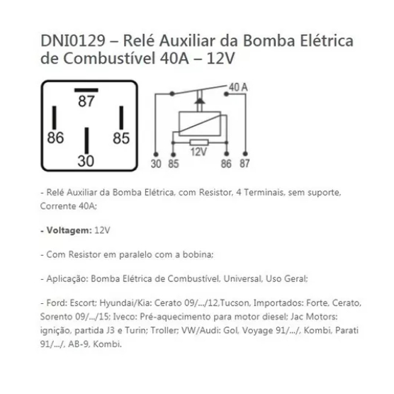 – Relé Auxiliar da Bomba Elétrica, com Resistor, 4 Terminais, sem suporte, Corrente 40A; – Voltagem: 12V – Com Resistor em paralelo com a bobina; – Aplicação: Bomba Elétrica de Combustível, Universal, Uso Geral; Volvo: XC; Renault: Clio, Sandero, Logan; Ford: Escort; Hyundai/Kia: Cerato 09/…/12,Tucson, Importados: Forte, Cerato, Sorento 09/…/15; Iveco: Pré-aquecimento para motor diesel; Jac Motors: ignição, partida J3 e Turin; Troller; VW/Audi: Gol, Voyage 91/…/, Kombi, Parati 91/…/, AB-9, Kombi.