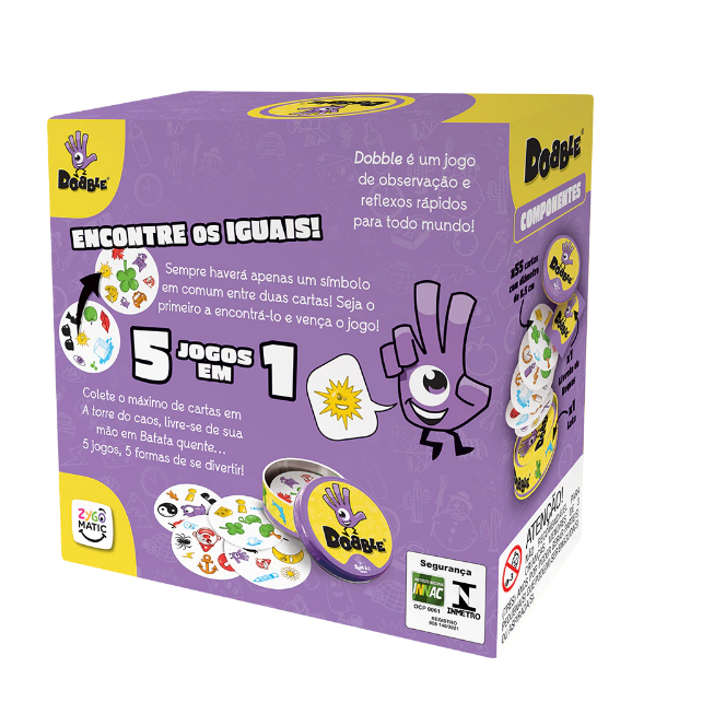O que é Dobble? Dobble é um jogo de sucesso mundial, um verdadeiro desafio de velocidade e observação no qual todos jogam ao mesmo tempo! O objetivo é conseguir identificar qual é o símbolo em comum entre duas cartas - e cada carta tem somente um símbolo em comum com qualquer outra carta do baralho. Todos os participantes têm a mesma chance de ganhar a rodada, por isso é preciso ser ágil! Como Jogar? Existem 5 modos de jogar, com regras tão simples que podem ser ensinadas em 1 minuto! Cada partida de Dobble tem menos de 15 minutos de duração, mas ninguém para em uma partida só. Os jogadores vão querer testar todos os modos de jogar dezenas de vezes! O objetivo é sempre identificar o elemento igual entre duas cartas primeiro. Mas dependendo do modo de jogo você poderá se livrar de suas cartas, entregar cartas para os seus oponentes ou até roubar cartas deles – o que deixa Dobble nunca ficar repetitivo! A embalagem de metal trabalhada em relevo facilita o transporte e a preservação das cartas. Seu formato compacto permite que ele possa ser jogado em praticamente qualquer lugar: em uma festa para quebrar o gelo, entre sessões mais longas de jogos ou mesmo em uma maratona incrível de mini-games - Dobble é pra todo momento! Informação tecnica: 55 Cartas 1 Folheto de regras 1 Lata para guardar os baralhos Jogadores: 2-8 Idade: 6+ Larg:13.00cm Alt: 8.00cm Comp:13.00cm 320.00g Garantia do Fornecedor: 3 meses Gantia do Vendedor: 7 dias Produto Original Novo, lacrado e acompanhado de Nota Fiscal.