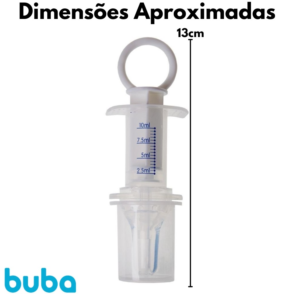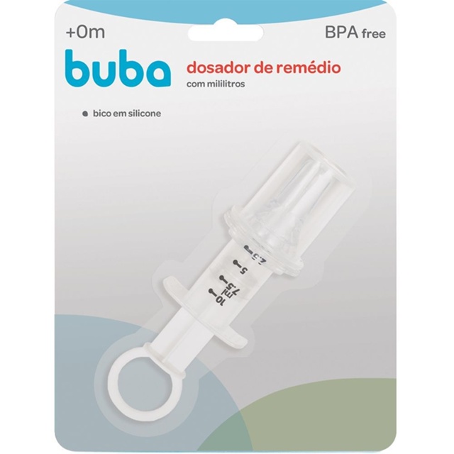 DESCRIÇÃO DO PRODUTO O Dosador de Remédio da Buba é super prático para a hora de dar medicamentos ao bebê e não errar na dose recomendada. O produto possui bico de silicone com formato anatômico que facilita colocar o remédio na boca da criança, sem derrubar e perder a dose. CARACTERÍSTICAS TÉCNICAS Conteúdo da Embalagem: 1 Dosador de Remédio Dimensões Aproximadas do Produto: 3 x 4 x 14 (Altura x Largura x Comprimento/Profundidade) Dimensões Aproximadas da Embalagem: 4 x 14 x 19 (Altura x Largura x Comprimento/Profundidade) Material/Composição: Polipropileno e Silicone Idade Mínima Recomendada: A partir de 0 Meses Marca: Buba Referência: 7556 Outras informações: As cores podem variar entre as imagens mostradas acima e o produto. Imagens meramente ilustrativas. Aviso: As informações e imagens divulgadas são de total responsabilidade do fabricante/fornecedor. APROVADO PELO INMETRO