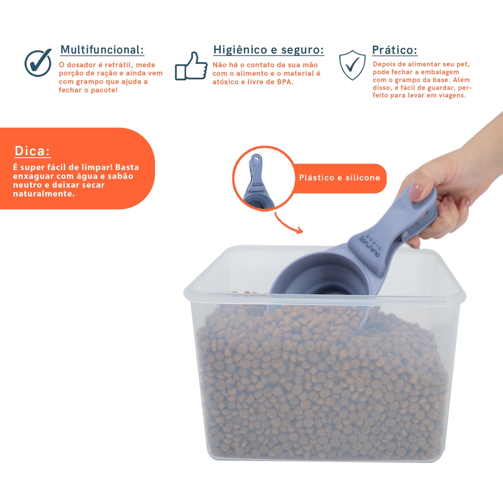 Conheça o dosador multifuncional fecha pacotes da Oikos Animal. Multifuncional: o dosador é retrátil, mede porção de ração e vem com grampo que ajuda a fechar o pacote. Retrátil: fácil de guardar e perfeito pra levar em viagens e garantir a porção correta pro pet. Prático: depois de alimentar seu pet, você pode fechar diretamente a embalagem com o grampo da base. Capacidade: até 273ml de água ou ração – uma xícara de chá. Vem com 3 medidas no seu interior. Higiênico: evita o contato da sua mão com o alimento. Atóxica e livre de BPA: pra você não precisar se preocupar com a segurança do seu pet. Leve praticidade para sua rotina!