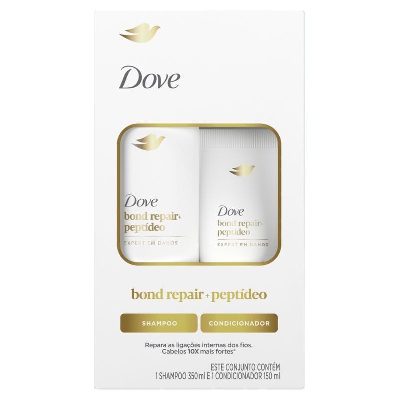 O mesmo Produto com embalagem diferente!!!! O que é o Dove Bond Intense Repair? Dov Bond Intense Repair é uma linha de produtos exclusivos desenvolvida especialmente para cabelos danificados ou quebradiços. Sua tecnologia patenteada conta com Bio-Protein Care, proteína 100% compatível com a estrutura natural do cabelo, que age em harmonia com a biologia capilar e reverte os sinais do dano; e Peptídeo Complex, microcomponentes da proteína que conseguem atingir as camadas mais internas da fibra para restaurar as ligações rompidas a nível molecular. Juntos, reparam os sinais de dano dos fios a nível molecular desde o primeiro uso. Para que serve o Kit Dove Bond Intense Repair shampoo + condicionador? Shampoo Dove Bond Intense Repair O Dove Bond Intense Repair é um shampoo de textura cremosa que limpa em profundidade enquanto repara a fibra capilar, para cabelos macios, saudáveis e brilhantes. Seu uso proporciona nutrição para os cabelos, deixando-os 10 vezes mais fortes*, 100% mais macios e com brilho extra. Condicionador Dove Bon Intense Repair O Dove Bond Intense Repair é um condicionador de textura cremosa que hidrata em profundidade enquanto repara a fibra capilar, para cabelos macios, saudáveis e brilhantes. Seu uso proporciona nutrição para os cabelos, deixando-os 10 vezes mais fortes*, 100% mais macios e com brilho extra. Como usar o Kit Dove Bond Intense Repair Shampoo + Condicionador? Shampoo Dove Bond Intense Repair Aplique o shampoo Dove nos cabelos molhados e massageie até formar espuma. Enxágue. Reaplique novamente se necessário. Condicionador Dove Bon Intense Repair Após o uso do shampoo Dove, aplique sobre todo o comprimento dos fios, até as pontas. Deixe agir por um minuto e enxágue. Para melhores resultados, experimente também outros produtos para cabelos Dove Bond Intense Repair. Advertências Uso externo. Não ingerir. Caso haja contato com os olhos, lave-os abundantemente. Se houver irritação, suspenda o uso imediatamente e procure orientação médica. Mantenha fora do alcance das crianças.
