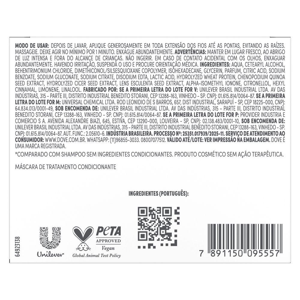"•Dove Máscara Bond Intense Repair + Peptídeos é uma máscara capilar para reconstrução intensa que trata profundamente fios danificados com benefícios visíveis em 1 minuto* •Máscara para etapa de reconstrução no cronograma com 12% de Peptídeo Complex que fortalece a fibra capilar e repara as ligações internas deixando os fios até 10X mais fortes* •Tratamento profundo com peptídeos para fios danificados que reduz pontas duplas, controla o frizz e promove brilho e maciez desde as primeiras aplicações •Formulada com a tecnologia Bio-Protein, resultado de mais de 10 anos de pesquisa, que repara, regenera e protege 90% da estrutura proteica do fio •Máscara Capilar 10 em 1 Bond Intense Repair + Peptídeo fortalece a fibra capilar, o creme reparador conta com textura cremosa que desembaraça facilmente e potencializa os resultados da linha completa • Indicada para todos os tipos de cabelo danificado, pode ser usada semanalmente ou na etapa de reconstrução do cronograma capilar Dove Máscara Capilar 10 em 1 Bond Intense Repair + Peptídeo é a escolha ideal para quem busca uma máscara capilar intensa com ação visível em apenas 1 minuto*. Sua fórmula poderosa trata profundamente os cabelos danificados, devolvendo resistência, brilho e maciez desde as primeiras aplicações. Com 12% de Peptídeo Complex e a exclusiva Tecnologia Bio-Protein, desenvolvida ao longo de mais de 10 anos de pesquisa, Dove oferece um tratamento profundo com peptídeos para fios danificados que atua a nível molecular. Essa tecnologia repara ligações internas e regenera até 90% da estrutura proteica dos fios, deixando os cabelos até 10x mais fortes*. A máscara entrega 10 benefícios em 1 minuto*, repara danos térmicos e químicos, hidrata, condiciona e nutre profundamente. Além disso, ela recupera a maleabilidade, reduz pontas duplas, controla o frizz, promove brilho extra, 100% mais maciez e a desejada sensação de fios desmaiados. Indicada para todos os tipos de cabelo danificado, essa máscara capilar pode ser usada semanalmente ou na etapa de reconstrução do cronograma capilar. Sua textura cremosa facilita o desembaraço e potencializa os resultados quando combinada ao shampoo, condicionador e finalizadores da linha Dove Bond Intense Repair + Peptídeo. *Com o uso do shampoo e condicionador da linha, comparado com shampoo sem ingredientes condicionantes."
